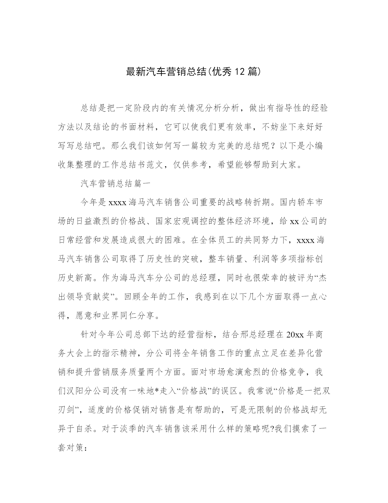 最新汽车营销总结(优秀12篇)总结是把一定阶段内的有关情况分析分析,做出有指导性的经验方法以及结论的书面材料,它可以使我们更有效率,不妨坐下来好好写写总结吧。那么我们该如何写一篇较为完美的总结呢?以下是小编收集整理的工作总结书范文,仅供参考,希望能够帮助到大家。汽车营销总结篇一今年是xxxx海马汽车销售公司重要的战略转折期。国内轿车市场的日益激烈的价格战、国家宏观调控的整体经济环境,给xx公司的日常经营和发展造成很大的困难。在全体员工的共同努力下,xxxx海马汽车销售公司取得了历史性的突破,整车销量、利润