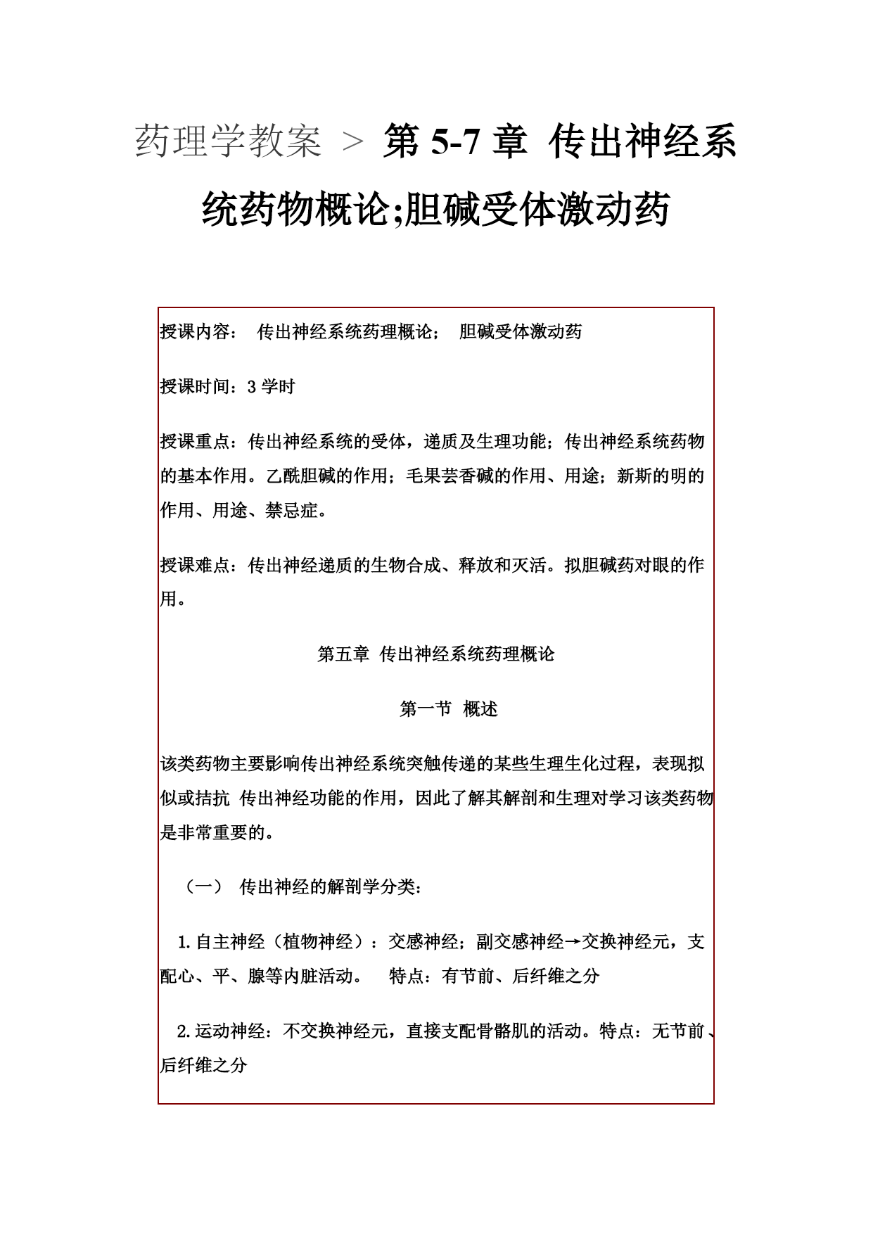 药理学教案 第5-7章传出神经系统药物概论胆碱受体激动药.doc