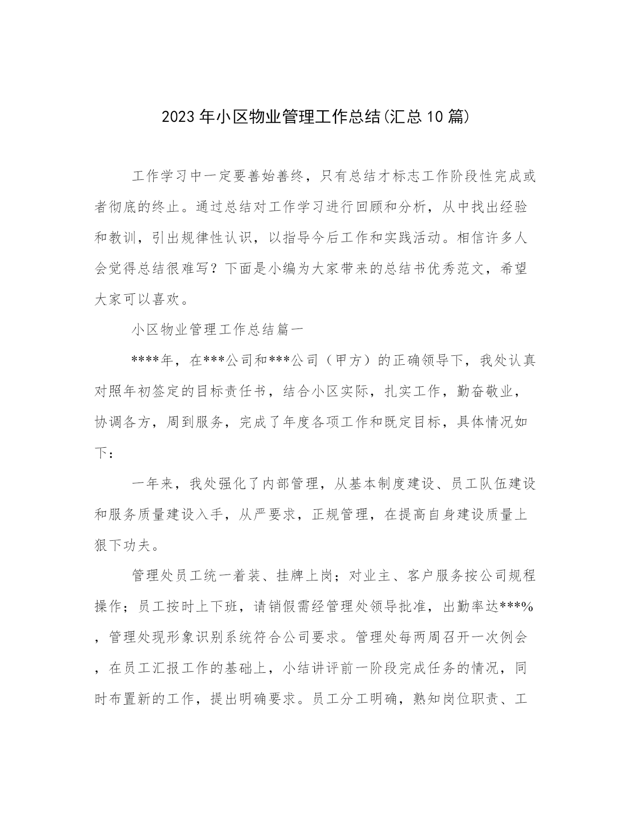 2023年小区物业管理工作总结(汇总10篇)工作学习中一定要善始善终,只有总结才标志工作阶段性完成或者彻底的终止。通过总结对工作学习进行回顾和分析,从中找出经验和教训,引出规律性认识,以指导今后工作和实践活动。相信许多人会觉得总结很难写?下面是小编为大家带来的总结书优秀范文,希望大家可以喜欢。小区物业管理工作总结篇一****年,在***公司和***公司(甲方)的正确领导下,我处认真对照年初签定的目标责任书,结合小区实际,扎实工作,勤奋敬业,协调各方,周到服务,完成了年度各项工作和既定目标,具体情况如下:一