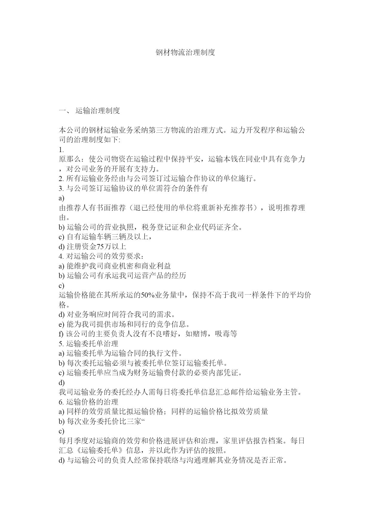 钢材物流治理制度一、运输治理制度本公司的钢材运输业务采纳第三方物流的治理方式。运力开发程序和运输公司的治理制度如下:1.原那么:使公司物资在运输过程中保持平安,运输本钱在同业中具有竞争力,对公司业务的开展有支持力。2.所有运输业务经由与公司签订过运输合作协议的单位施行。3.与公司签订运输协议的单位需符合的条件有a)由推荐人有书面推荐(退已经使用的单位将重新补充推荐书),说明推荐理由。b)运输公司的营业执照,税务登记证和企业代码证齐全。c)自有运输车辆三辆及以上,d)注册资金75万以上4.对运输公司的效劳要