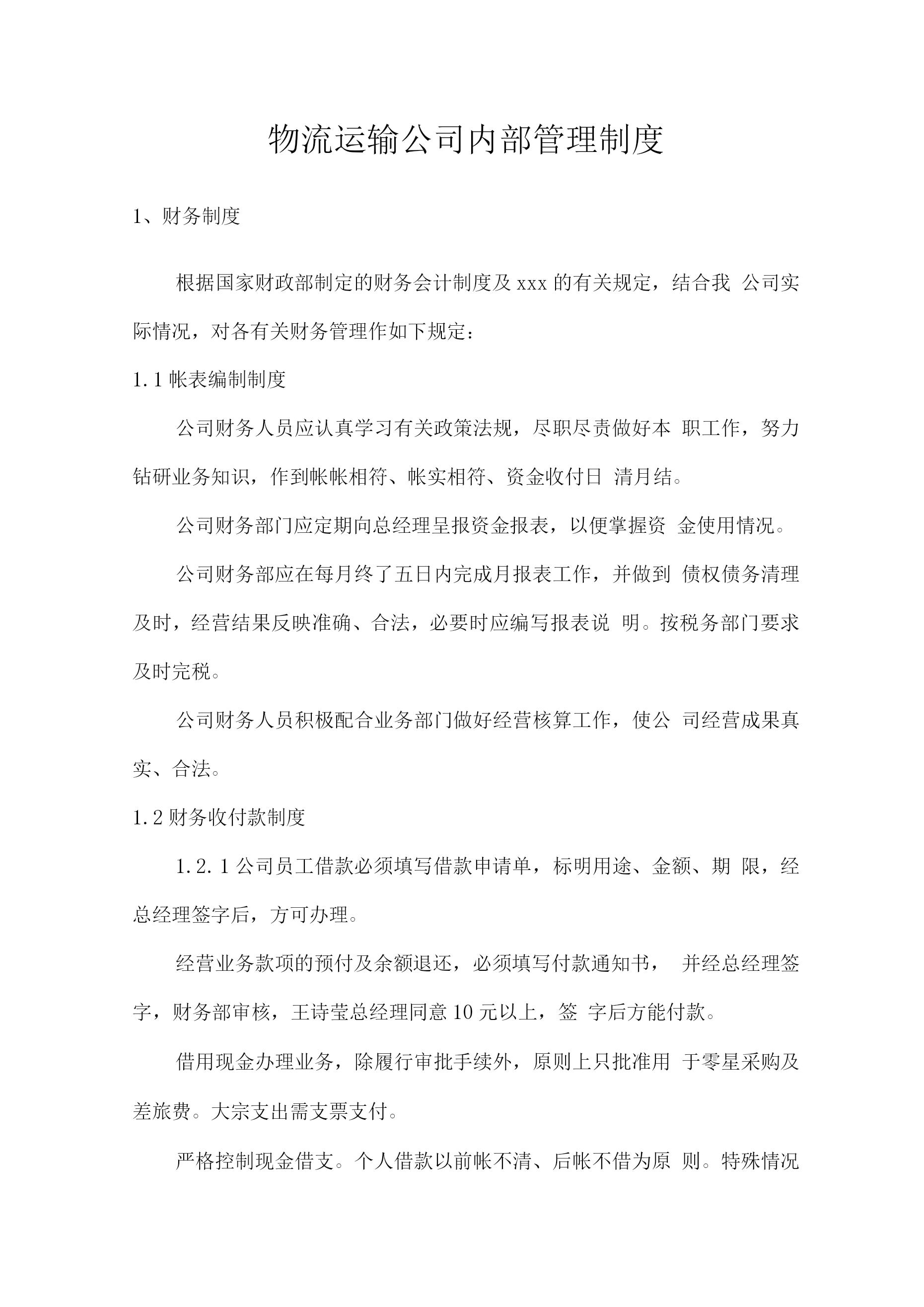 物流运输公司内部管理制度1、财务制度根据国家财政部制定的财务会计制度及xxx的有关规定,结合我公司实际情况,对各有关财务管理作如下规定:1.1帐表编制制度公司财务人员应认真学习有关政策法规,尽职尽责做好本职工作,努力钻研业务知识,作到帐帐相符、帐实相符、资金收付日清月结。公司财务部门应定期向总经理呈报资金报表,以便掌握资金使用情况。公司财务部应在每月终了五日内完成月报表工作,并做到债权债务清理及时,经营结果反映准确、合法,必要时应编写报表说明。按税务部门要求及时完税。公司财务人员积极配合业务部门做好经营核