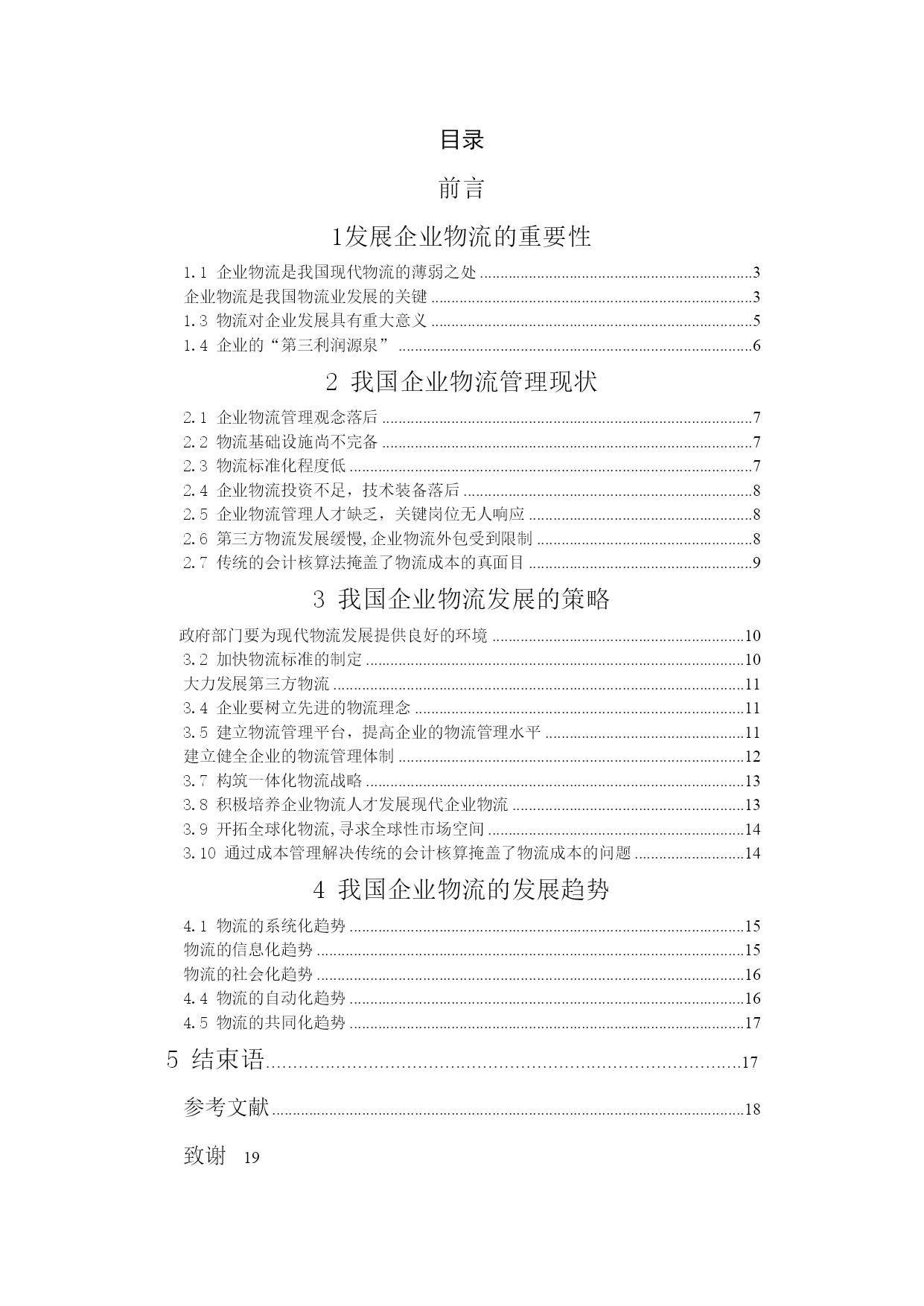 目录前言TOC\o"1-3"\h\z\uHYPERLINK\l"_Toc201914968"1发展企业物流的重要性HYPERLINK\l"_Toc201914969"1.1企业物流是我国现代物流的薄弱之处PAGEREF_Toc201914969\h3HYPERLINK\l"_Toc201914970"企业物流是我国物流业发展的关键PAGEREF_Toc201914970\h3HYPERLINK\l"_Toc201914971"1.3物流对企业发展具有重大意义PAGE