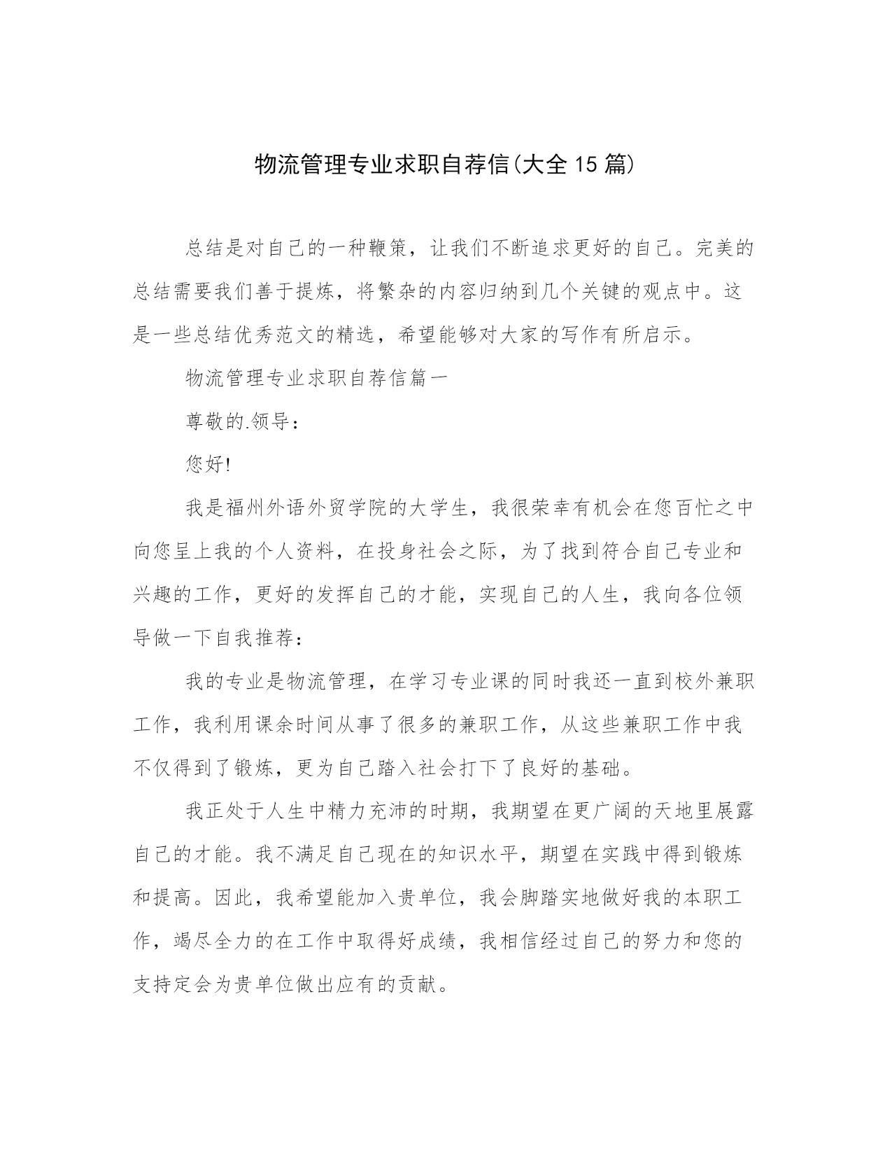 物流管理专业求职自荐信(大全15篇)总结是对自己的一种鞭策,让我们不断追求更好的自己。完美的总结需要我们善于提炼,将繁杂的内容归纳到几个关键的观点中。这是一些总结优秀范文的精选,希望能够对大家的写作有所启示。物流管理专业求职自荐信篇一尊敬的.领导:您好!我是福州外语外贸学院的大学生,我很荣幸有机会在您百忙之中向您呈上我的个人资料,在投身社会之际,为了找到符合自己专业和兴趣的工作,更好的发挥自己的才能,实现自己的人生,我向各位领导做一下自我推荐:我的专业是物流管理,在学习专业课的同时我还一直到校外兼职工作,