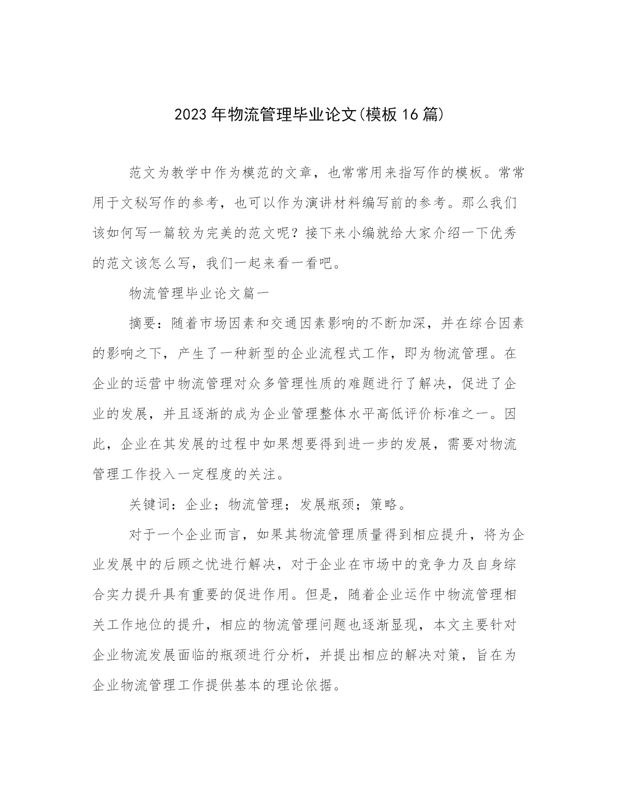 2023年物流管理毕业论文(模板16篇)范文为教学中作为模范的文章,也常常用来指写作的模板。常常用于文秘写作的参考,也可以作为演讲材料编写前的参考。那么我们该如何写一篇较为完美的范文呢?接下来小编就给大家介绍一下优秀的范文该怎么写,我们一起来看一看吧。物流管理毕业论文篇一摘要:随着市场因素和交通因素影响的不断加深,并在综合因素的影响之下,产生了一种新型的企业流程式工作,即为物流管理。在企业的运营中物流管理对众多管理性质的难题进行了解决,促进了企业的发展,并且逐渐的成为企业管理整体水平高低评价标准之一。因此
