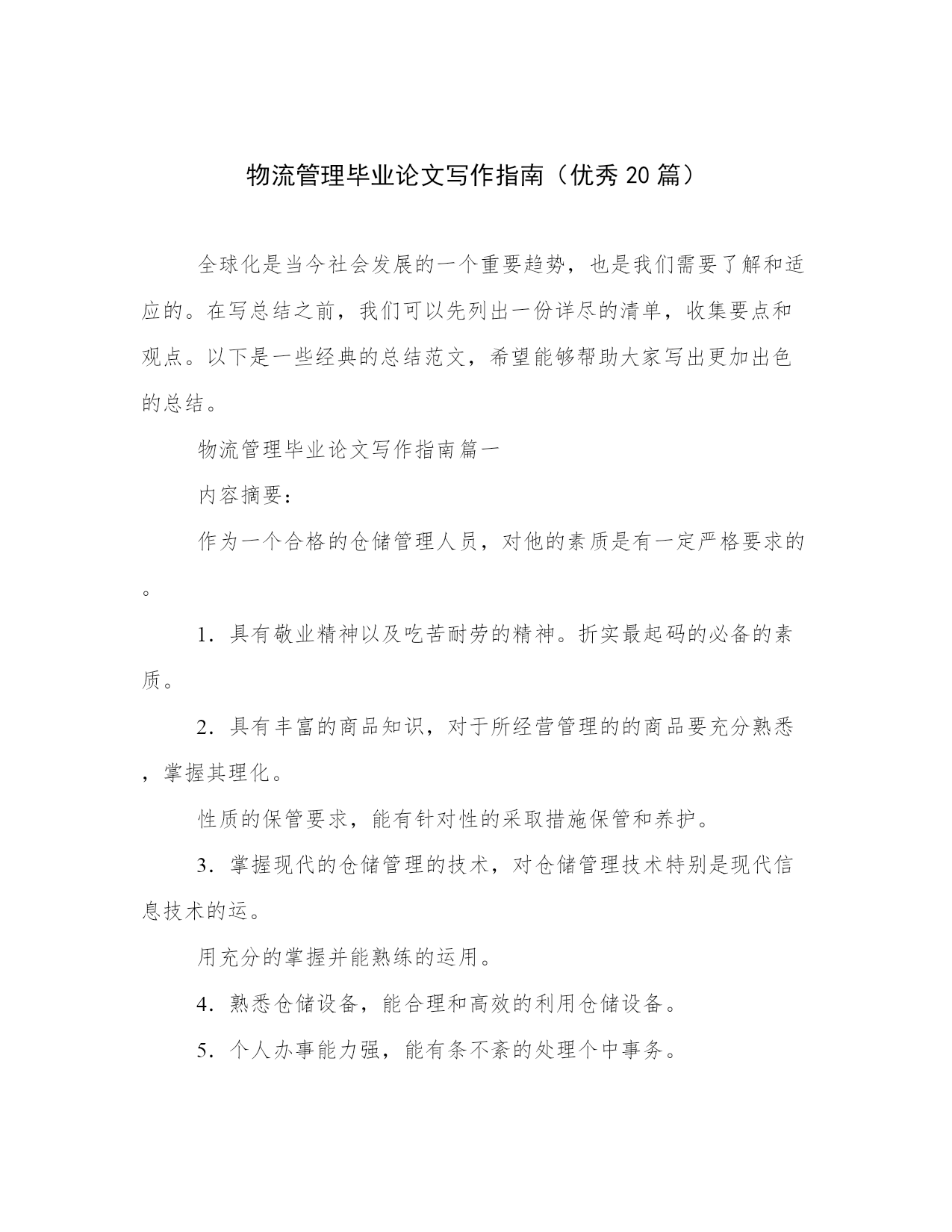 物流管理毕业论文写作指南(优秀20篇)全球化是当今社会发展的一个重要趋势,也是我们需要了解和适应的。在写总结之前,我们可以先列出一份详尽的清单,收集要点和观点。以下是一些经典的总结范文,希望能够帮助大家写出更加出色的总结。物流管理毕业论文写作指南篇一内容摘要:作为一个合格的仓储管理人员,对他的素质是有一定严格要求的。1.具有敬业精神以及吃苦耐劳的精神。折实最起码的必备的素质。2.具有丰富的商品知识,对于所经营管理的的商品要充分熟悉,掌握其理化。性质的保管要求,能有针对性的采取措施保管和养护。3.掌握现代的