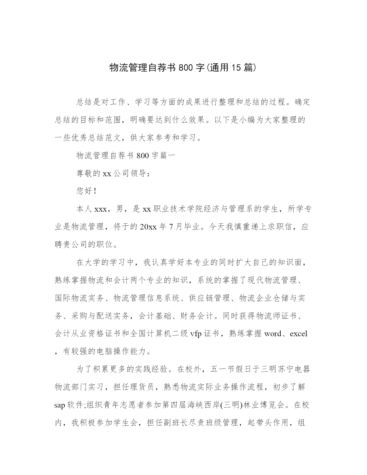 物流管理自荐书800字(通用15篇)总结是对工作、学习等方面的成果进行整理和总结的过程。确定总结的目标和范围,明确要达到什么效果。以下是小编为大家整理的一些优秀总结范文,供大家参考和学习。物流管理自荐书800字篇一尊敬的xx公司领导:您好!本人xxx,男,是xx职业技术学院经济与管理系的学生,所学专业是物流管理,将于的20xx年7月毕业。今天我慎重递上求职信,应聘贵公司的职位。在大学的学习中,我认真学好本专业的同时扩大自己的知识面,熟练掌握物流和会计两个专业的知识,系统的掌握了现代物流管理、国际物流实务、