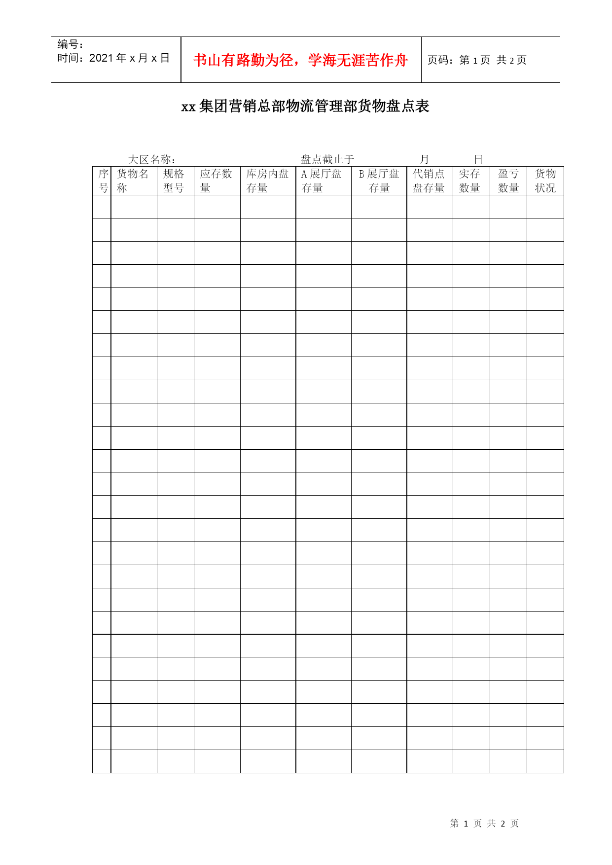 编号:时间:2021年x月x日书山有路勤为径,学海无涯苦作舟页码:第PAGE2页共NUMPAGES2页第PAGE\*MERGEFORMAT2页共NUMPAGES\*MERGEFORMAT2页xx集团营销总部物流管理部货物盘点表大区名称:盘点截止于月日序号货物名称规格型号应存数量库房内盘存量A展厅盘存量B展厅盘存量代销点盘存量实存数量盈亏数量货物状况