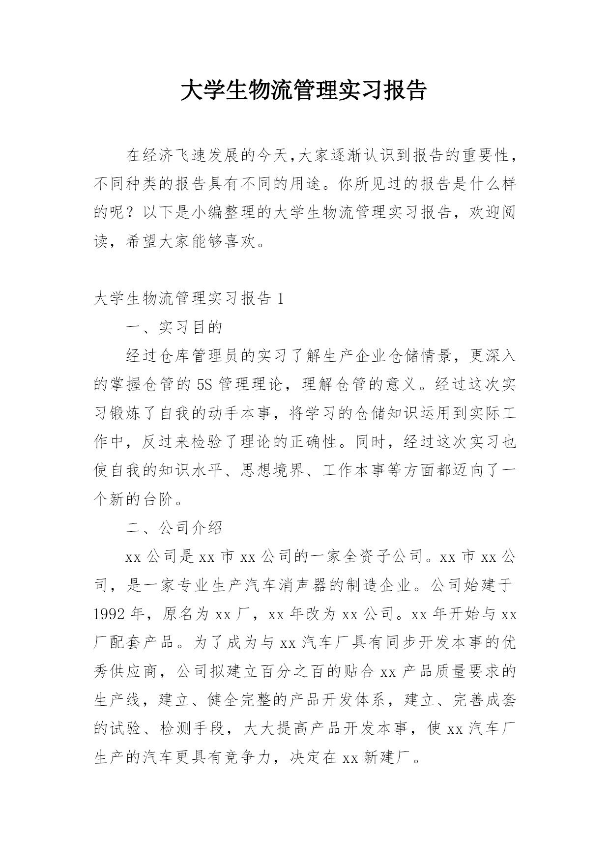 大学生物流管理实习报告在经济飞速发展的今天,大家逐渐认识到报告的重要性,不同种类的报告具有不同的用途。你所见过的报告是什么样的呢?以下是小编整理的大学生物流管理实习报告,欢迎阅读,希望大家能够喜欢。大学生物流管理实习报告1一、实习目的经过仓库管理员的实习了解生产企业仓储情景,更深入的掌握仓管的5S管理理论,理解仓管的意义。经过这次实习锻炼了自我的动手本事,将学习的仓储知识运用到实际工作中,反过来检验了理论的正确性。同时,经过这次实习也使自我的知识水平、思想境界、工作本事等方面都迈向了一个新的台阶。二、公司