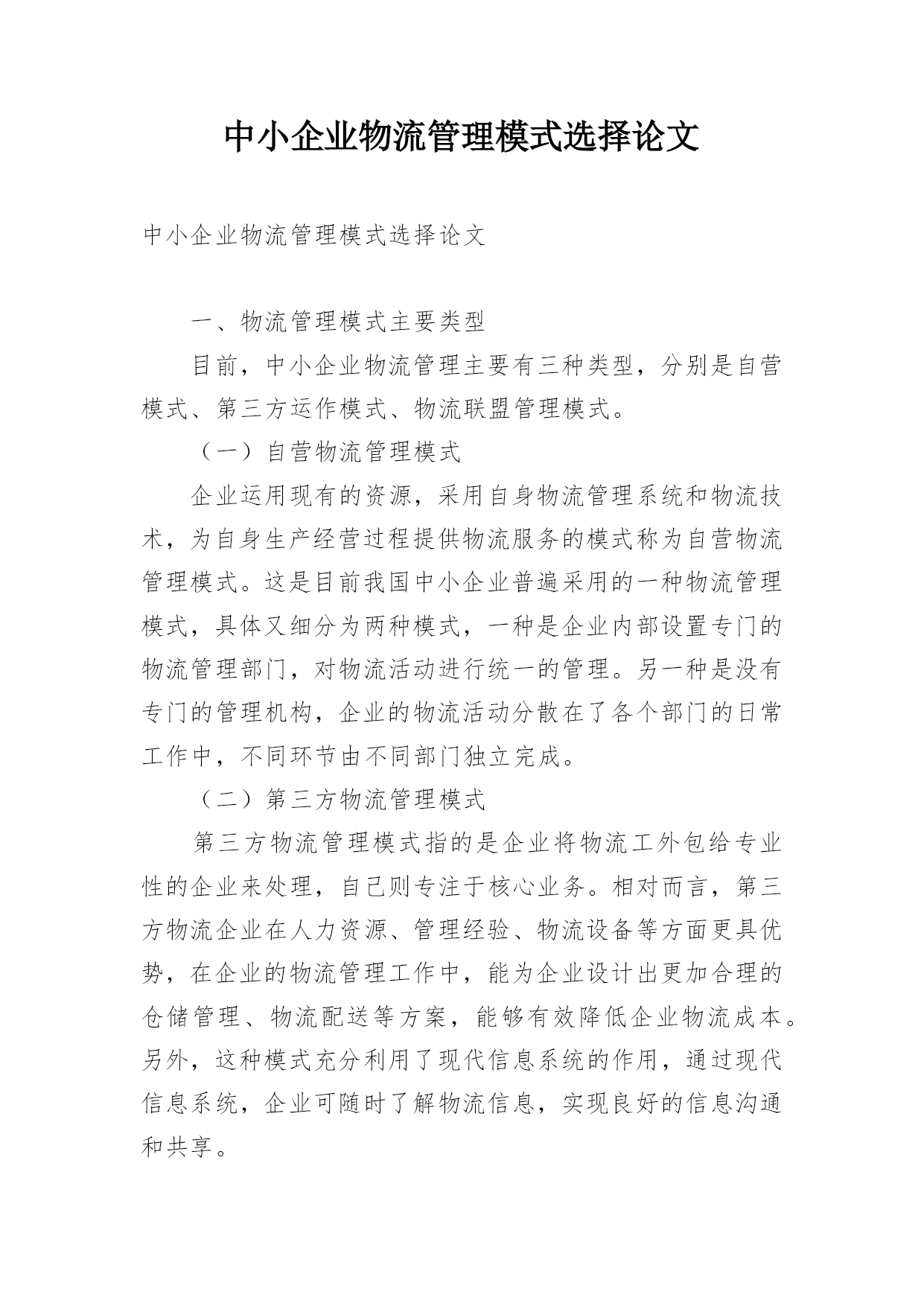 中小企业物流管理模式选择论文中小企业物流管理模式选择论文一、物流管理模式主要类型目前,中小企业物流管理主要有三种类型,分别是自营模式、第三方运作模式、物流联盟管理模式。(一)自营物流管理模式企业运用现有的资源,采用自身物流管理系统和物流技术,为自身生产经营过程提供物流服务的模式称为自营物流管理模式。这是目前我国中小企业普遍采用的一种物流管理模式,具体又细分为两种模式,一种是企业内部设置专门的物流管理部门,对物流活动进行统一的管理。另一种是没有专门的管理机构,企业的物流活动分散在了各个部门的日常工作中,不同