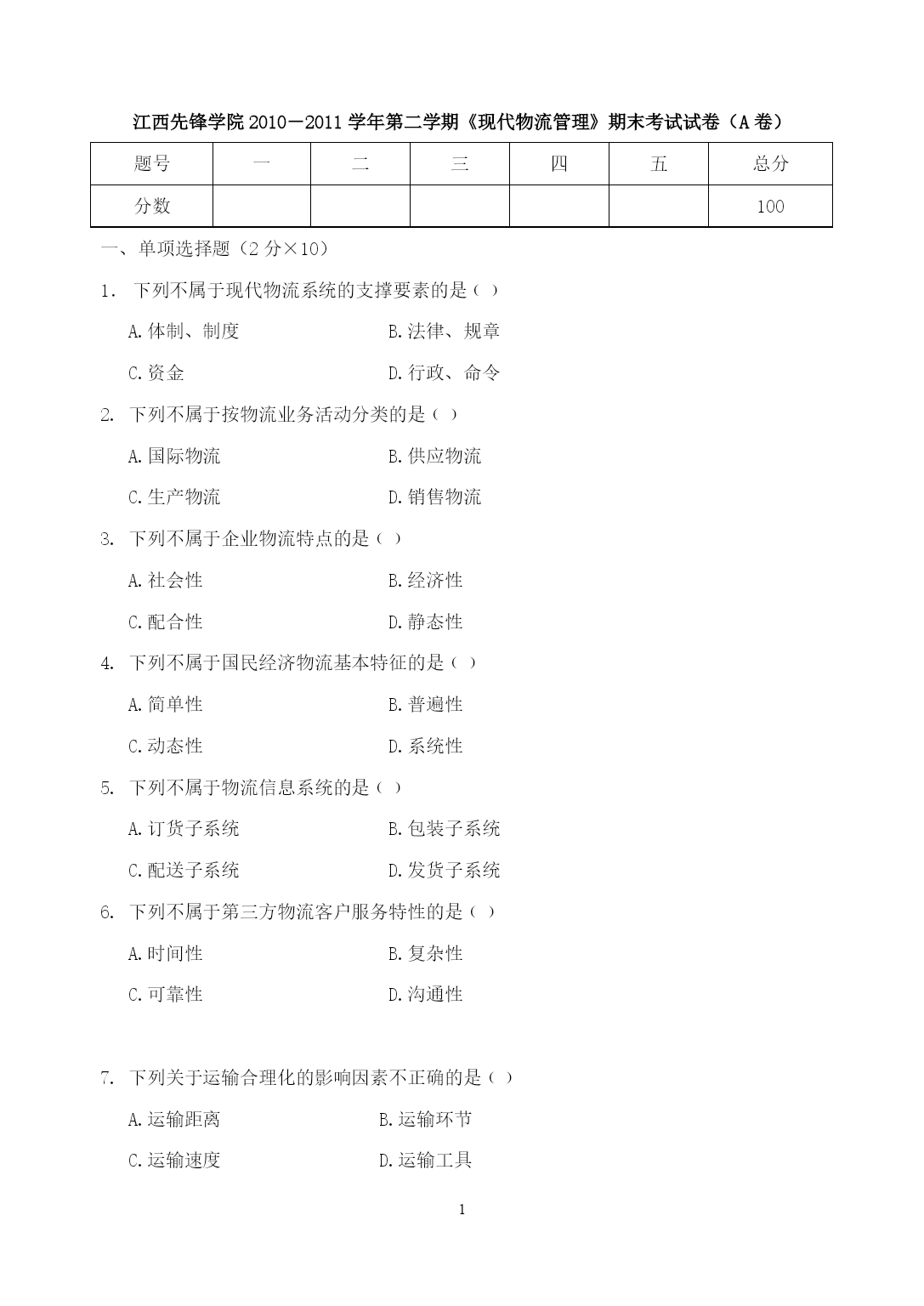 江西先锋学院2010-2011学年第二学期《现代物流管理》期末考试试卷(A卷)题号一二三四五总分分数100一、单项选择题(2分×10)下列不属于现代物流系统的支撑要素的是﹙﹚A.体制、制度B.法律、规章C.资金D.行政、命令2.下列不属于按物流业务活动分类的是﹙﹚A.国际物流B.供应物流C.生产物流D.销售物流3.下列不属于企业物流特点的是﹙﹚A.社会性B.经济性C.配合性D.静态性4.下列不属于国民经济物流基本特征的是﹙﹚A.简单性B.普遍性C.动态性D.系统性5.下列不属于物流信息系统的是﹙﹚A.订货
