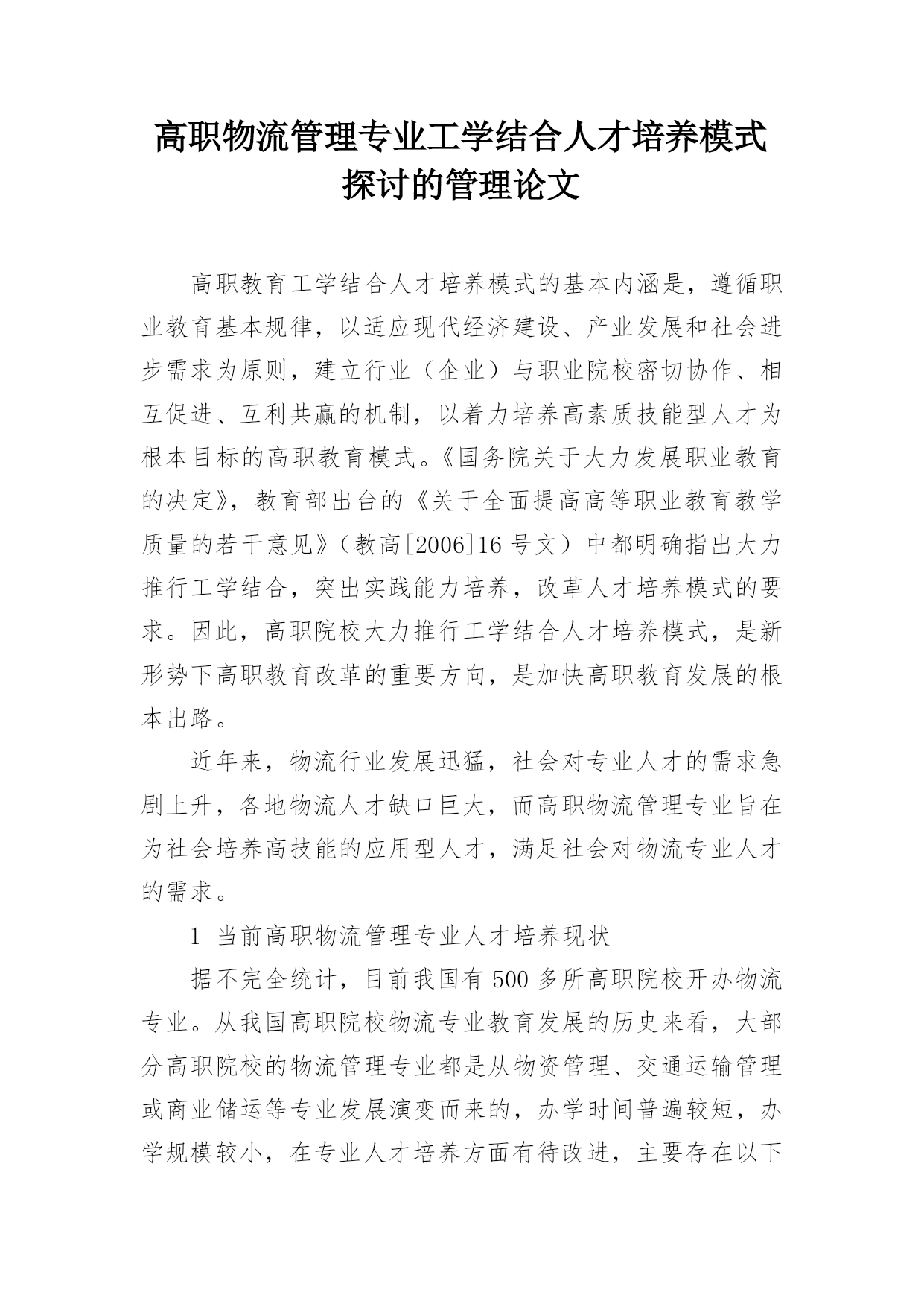 高职物流管理专业工学结合人才培养模式探讨的管理论文.docx