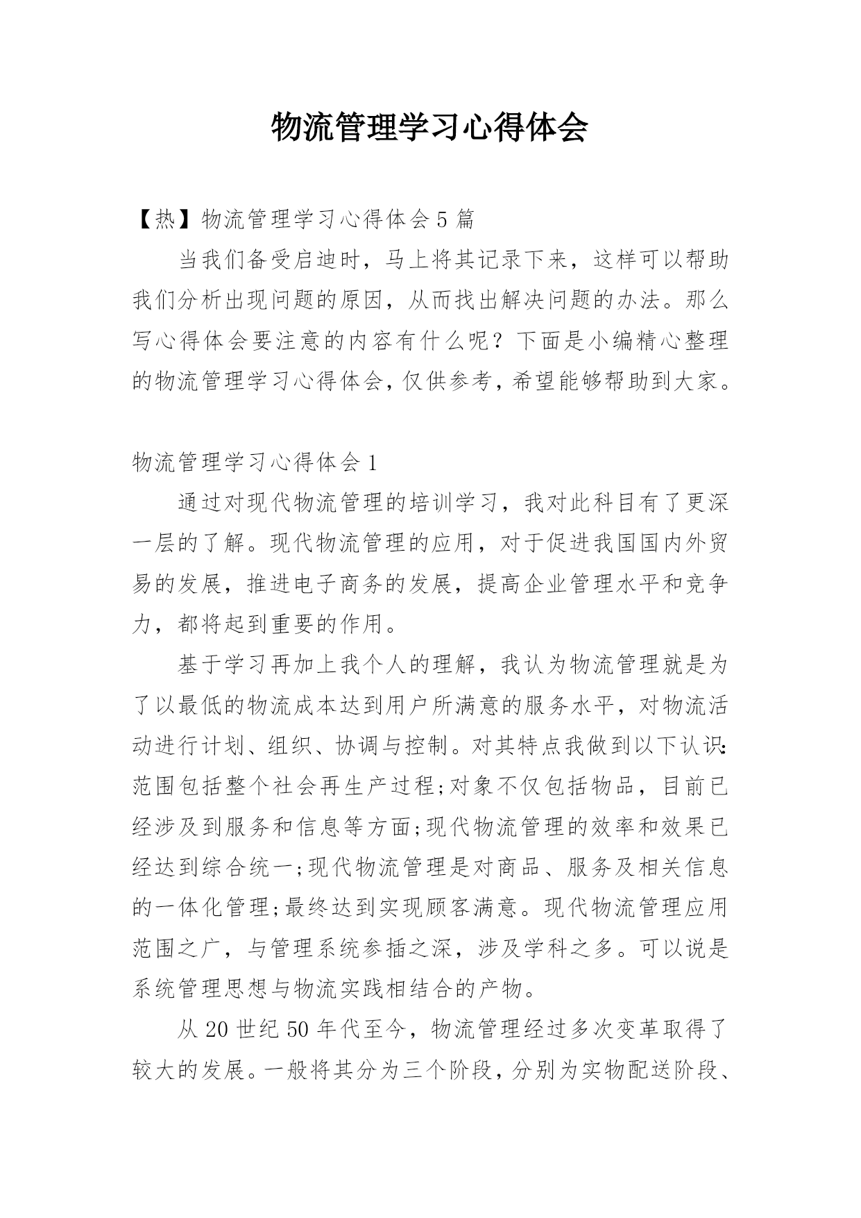 物流管理学习心得体会【热】物流管理学习心得体会5篇当我们备受启迪时,马上将其记录下来,这样可以帮助我们分析出现问题的原因,从而找出解决问题的办法。那么写心得体会要注意的内容有什么呢?下面是小编精心整理的物流管理学习心得体会,仅供参考,希望能够帮助到大家。物流管理学习心得体会1通过对现代物流管理的培训学习,我对此科目有了更深一层的了解。现代物流管理的应用,对于促进我国国内外贸易的发展,推进电子商务的发展,提高企业管理水平和竞争力,都将起到重要的作用。基于学习再加上我个人的理解,我认为物流管理就是为了以最低的
