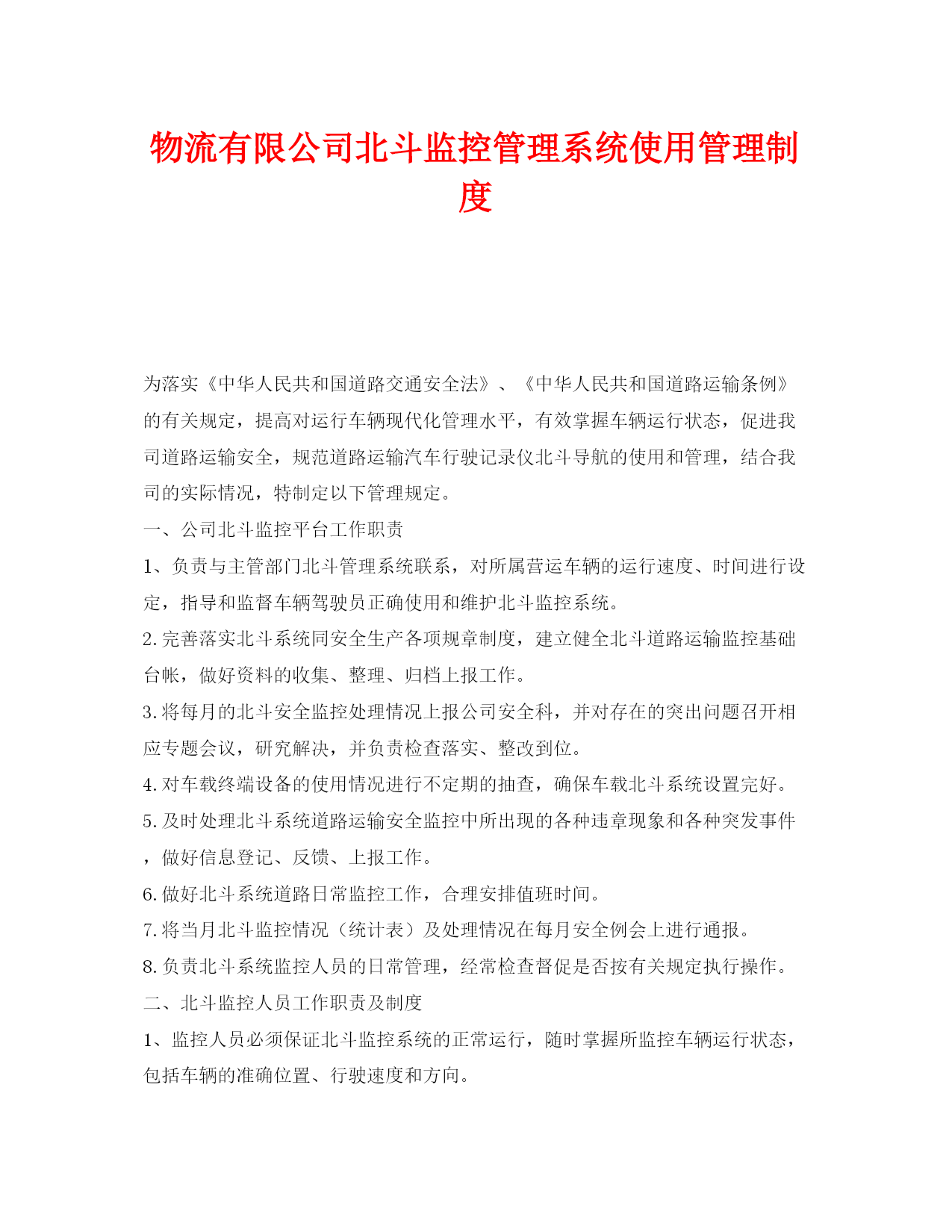 此资料由网络收集而来,如有侵权请告知上传者立即删除。资料共分享,我们负责传递知识。物流有限公司北斗监控管理系统使用管理制度为落实《中华人民共和国道路交通安全法》、《中华人民共和国道路运输条例》的有关规定,提高对运行车辆现代化管理水平,有效掌握车辆运行状态,促进我司道路运输安全,规范道路运输汽车行驶记录仪北斗导航的使用和管理,结合我司的实际情况,特制定以下管理规定。一、公司北斗监控平台工作职责l、负责与主管部门北斗管理系统联系,对所属营运车辆的运行速度、时间进行设定,指导和监督车辆驾驶员正确使用和维护北斗监