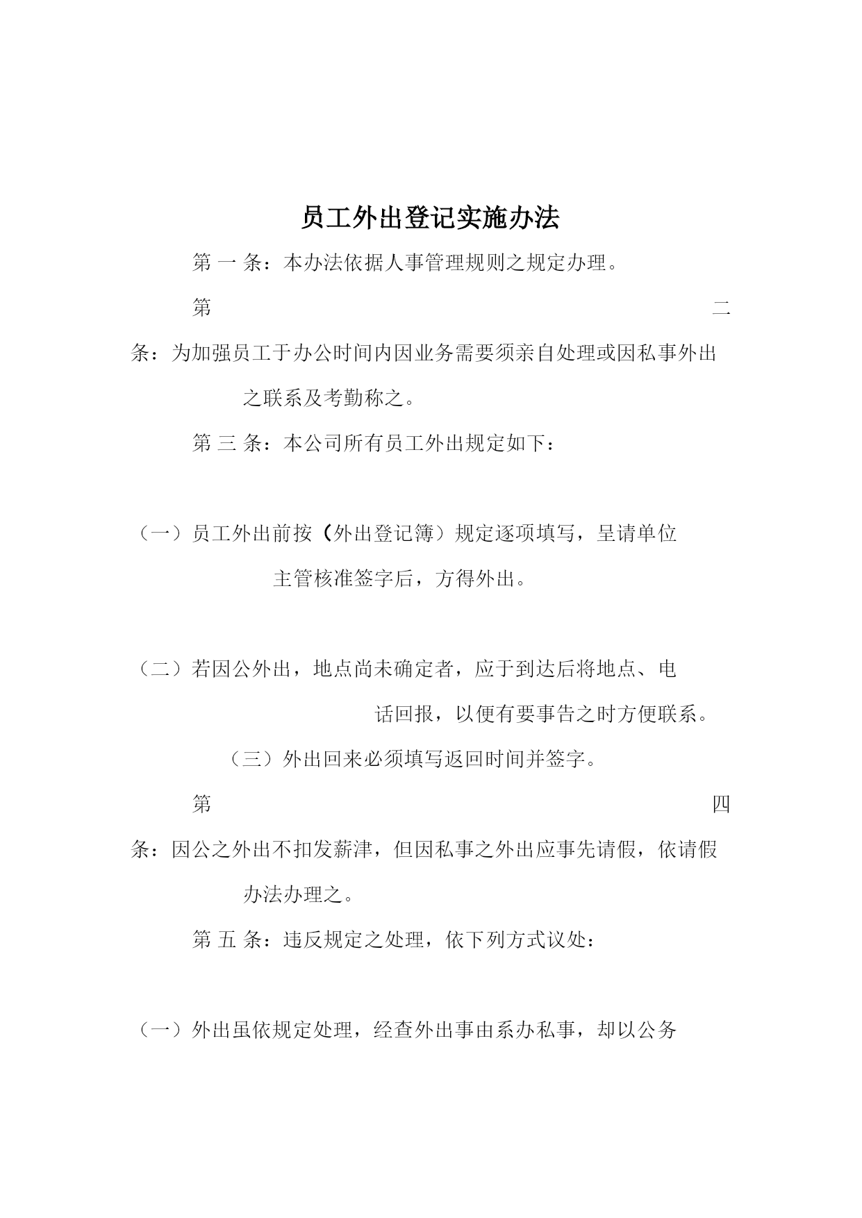 员工外出登记实施办法第一条:本办法依据人事管理规则之规定办理。第二条:为加强员工于办公时间内因业务需要须亲自处理或因私事外出之联系及考勤称之。第三条:本公司所有员工外出规定如下:(一)员工外出前按(外出登记簿)规定逐项填写,呈请单位主管核准签字后,方得外出。(二)若因公外出,地点尚未确定者,应于到达后将地点、电话回报,以便有要事告之时方便联系。(三)外出回来必须填写返回时间并签字。第四条:因公之外出不扣发薪津,但因私事之外出应事先请假,依请假办法办理之。第五条:违反规定之处理,依下列方式议处:(一)外出虽