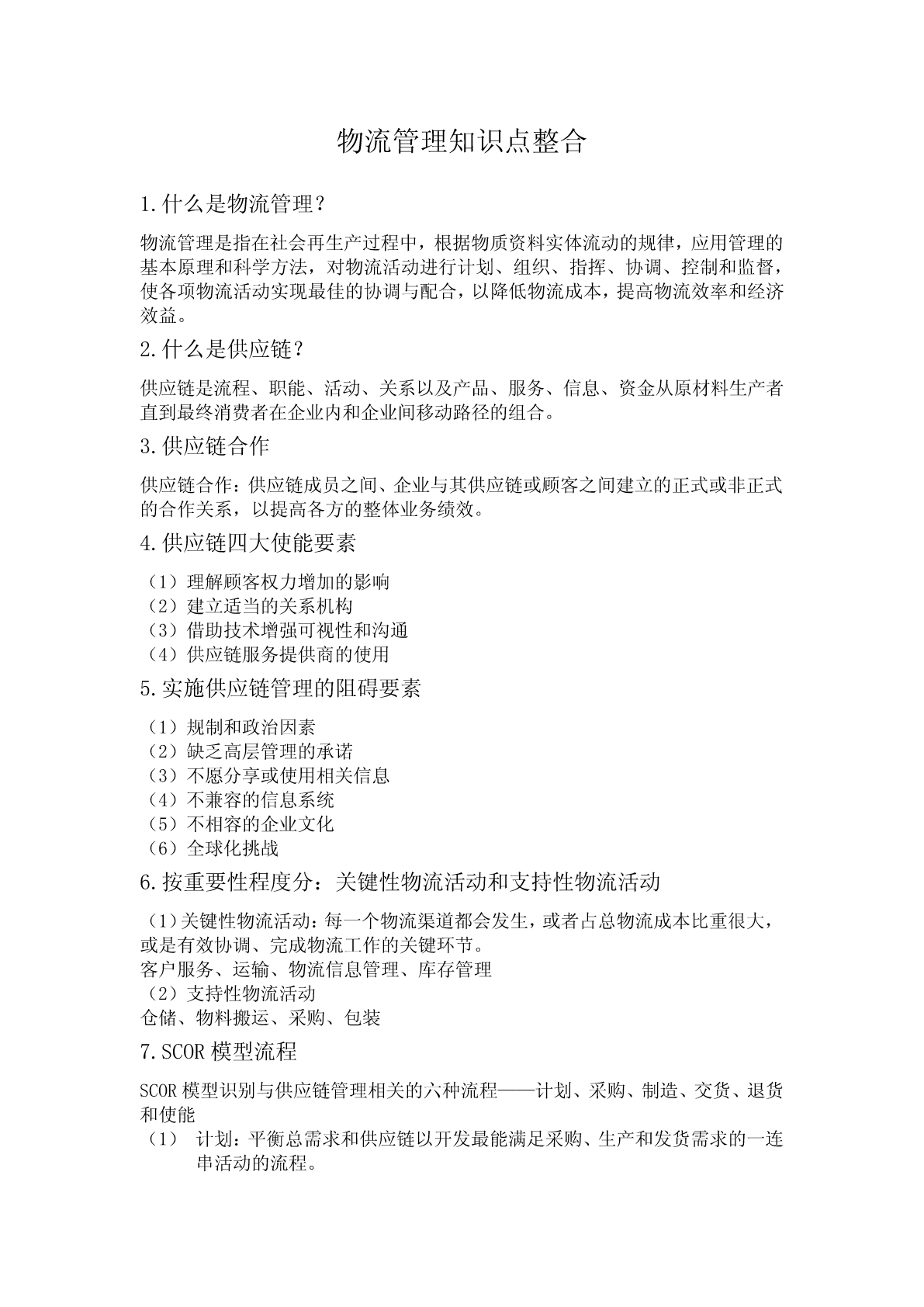 物流管理知识点整合1.什么是物流管理?物流管理是指在社会再生产过程中,根据物质资料实体流动的规律,应用管理的基本原理和科学方法,对物流活动进行计划、组织、指挥、协调、控制和监督,使各项物流活动实现最佳的协调与配合,以降低物流成本,提高物流效率和经济效益。2.什么是供应链?供应链是流程、职能、活动、关系以及产品、服务、信息、资金从原材料生产者直到最终消费者在企业内和企业间移动路径的组合。3.供应链合作供应链合作:供应链成员之间、企业与其供应链或顾客之间建立的正式或非正式的合作关系,以提高各方的整体业务绩效。