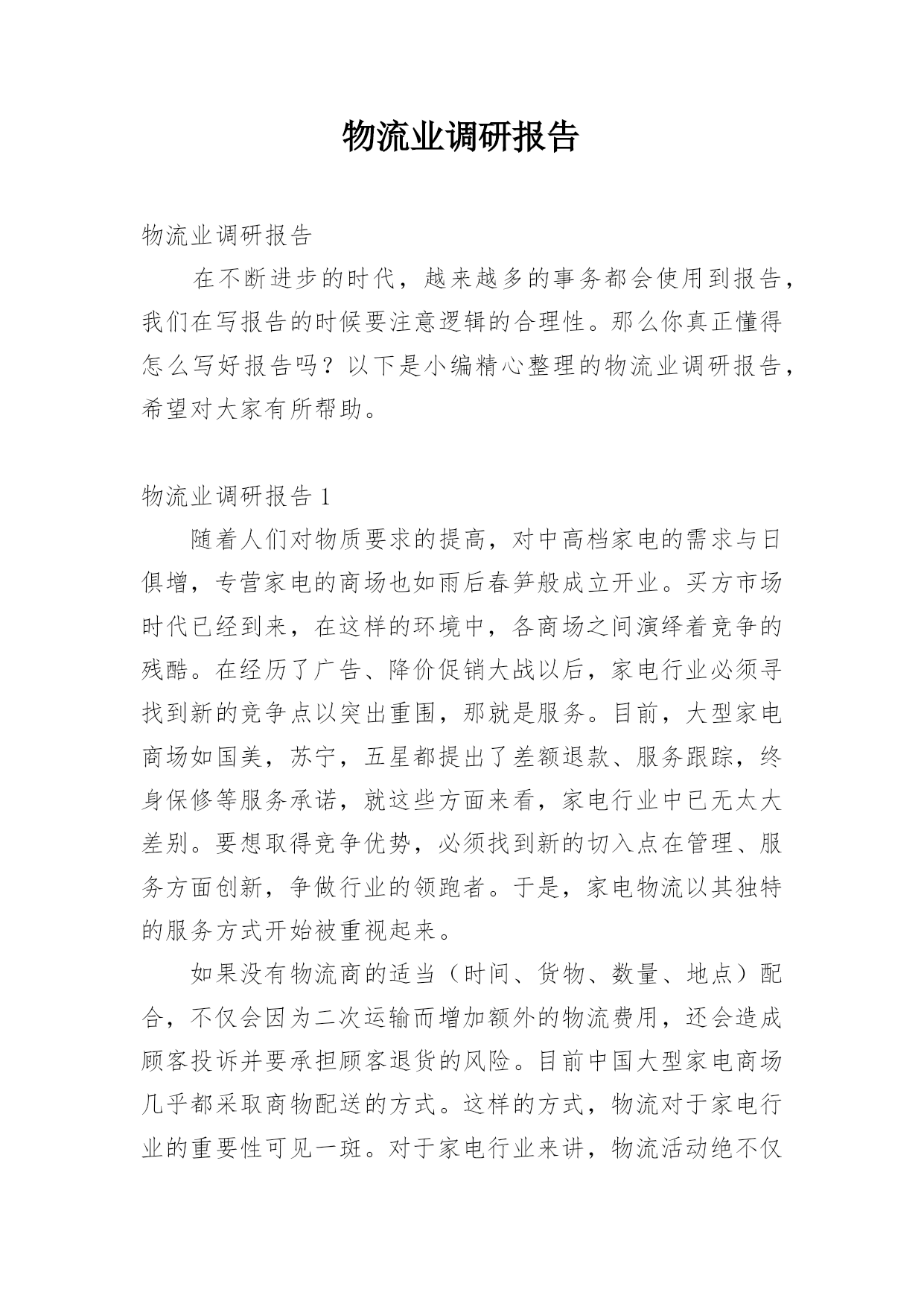 物流业调研报告物流业调研报告在不断进步的时代,越来越多的事务都会使用到报告,我们在写报告的时候要注意逻辑的合理性。那么你真正懂得怎么写好报告吗?以下是小编精心整理的物流业调研报告,希望对大家有所帮助。物流业调研报告1随着人们对物质要求的提高,对中高档家电的需求与日俱增,专营家电的商场也如雨后春笋般成立开业。买方市场时代已经到来,在这样的环境中,各商场之间演绎着竞争的残酷。在经历了广告、降价促销大战以后,家电行业必须寻找到新的竞争点以突出重围,那就是服务。目前,大型家电商场如国美,苏宁,五星都提出了差额退款