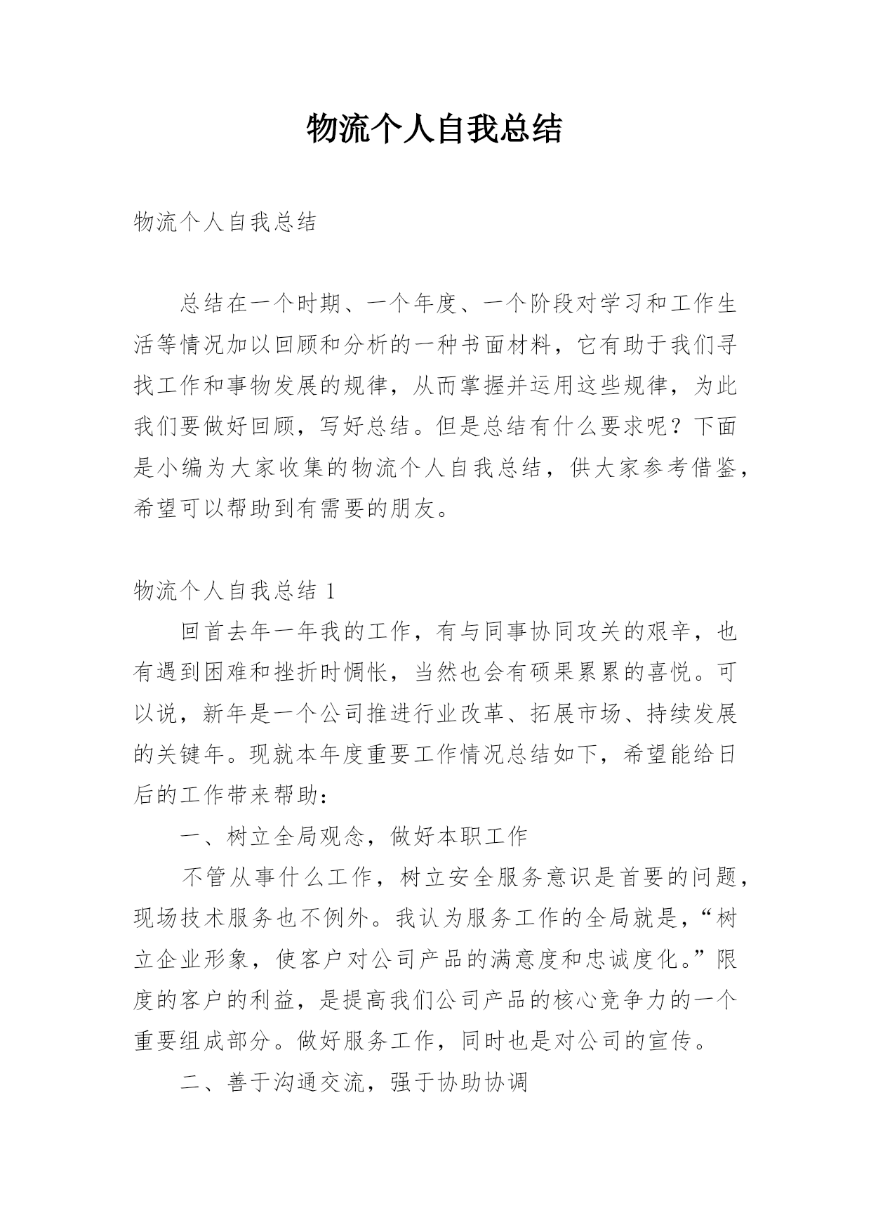 物流个人自我总结物流个人自我总结总结在一个时期、一个年度、一个阶段对学习和工作生活等情况加以回顾和分析的一种书面材料,它有助于我们寻找工作和事物发展的规律,从而掌握并运用这些规律,为此我们要做好回顾,写好总结。但是总结有什么要求呢?下面是小编为大家收集的物流个人自我总结,供大家参考借鉴,希望可以帮助到有需要的朋友。物流个人自我总结1回首去年一年我的工作,有与同事协同攻关的艰辛,也有遇到困难和挫折时惆怅,当然也会有硕果累累的喜悦。可以说,新年是一个公司推进行业改革、拓展市场、持续发展的关键年。现就本年度重要