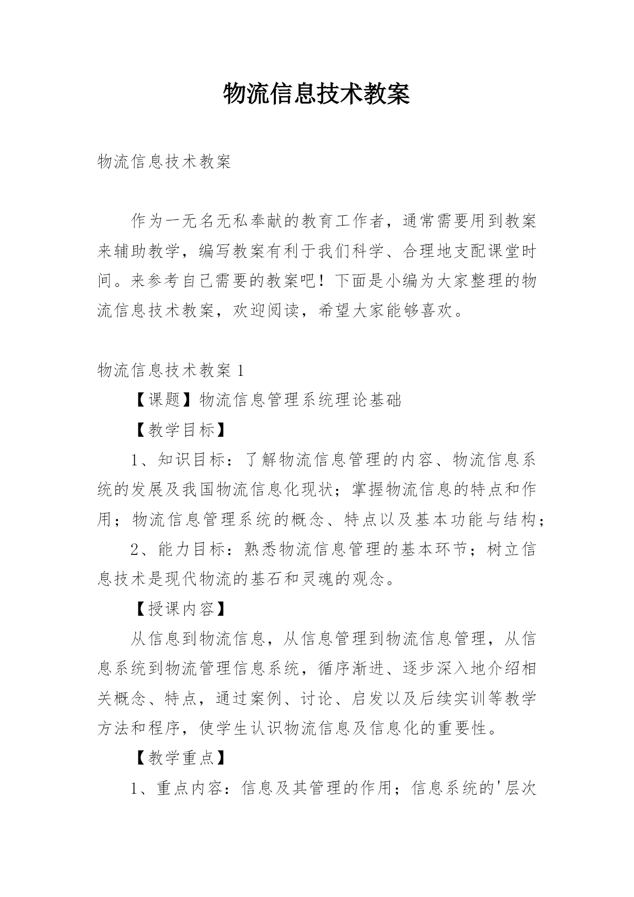 物流信息技术教案物流信息技术教案作为一无名无私奉献的教育工作者,通常需要用到教案来辅助教学,编写教案有利于我们科学、合理地支配课堂时间。来参考自己需要的教案吧!下面是小编为大家整理的物流信息技术教案,欢迎阅读,希望大家能够喜欢。物流信息技术教案1【课题】物流信息管理系统理论基础【教学目标】1、知识目标:了解物流信息管理的内容、物流信息系统的发展及我国物流信息化现状;掌握物流信息的特点和作用;物流信息管理系统的概念、特点以及基本功能与结构;2、能力目标:熟悉物流信息管理的基本环节;树立信息技术是现代物流的基