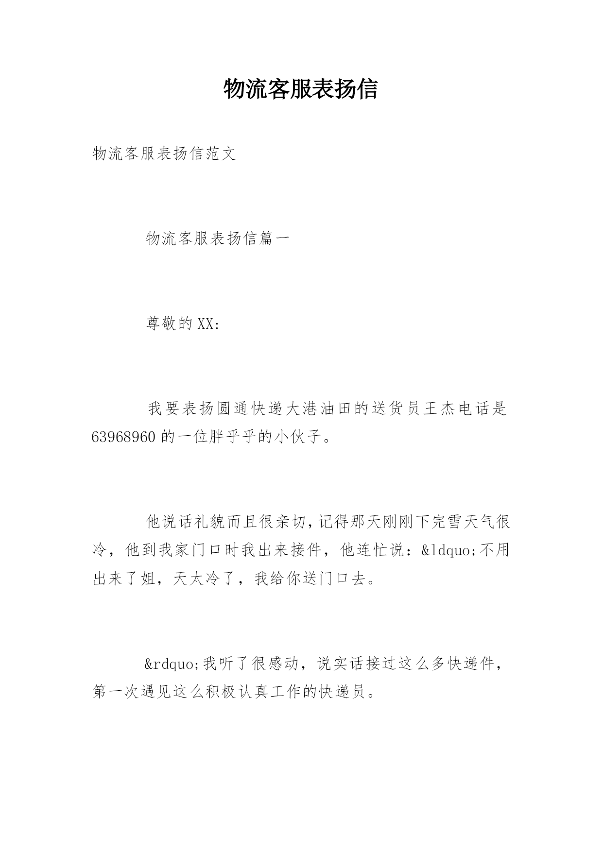 物流客服表扬信物流客服表扬信范文物流客服表扬信篇一尊敬的XX:我要表扬圆通快递大港油田的送货员王杰电话是63968960的一位胖乎乎的小伙子。他说话礼貌而且很亲切,记得那天刚刚下完雪天气很冷,他到我家门口时我出来接件,他连忙说:“不用出来了姐,天太冷了,我给你送门口去。”我听了很感动,说实话接过这么多快递件,第一次遇见这么积极认真工作的快递员。我以前遇见的快递员总是一副牛气哄哄的样子,就好像谁都欠他们钱似的,一到天气不好了,就晚一天再送,打电话给他们,还没等说完话就挂电话了,很不礼