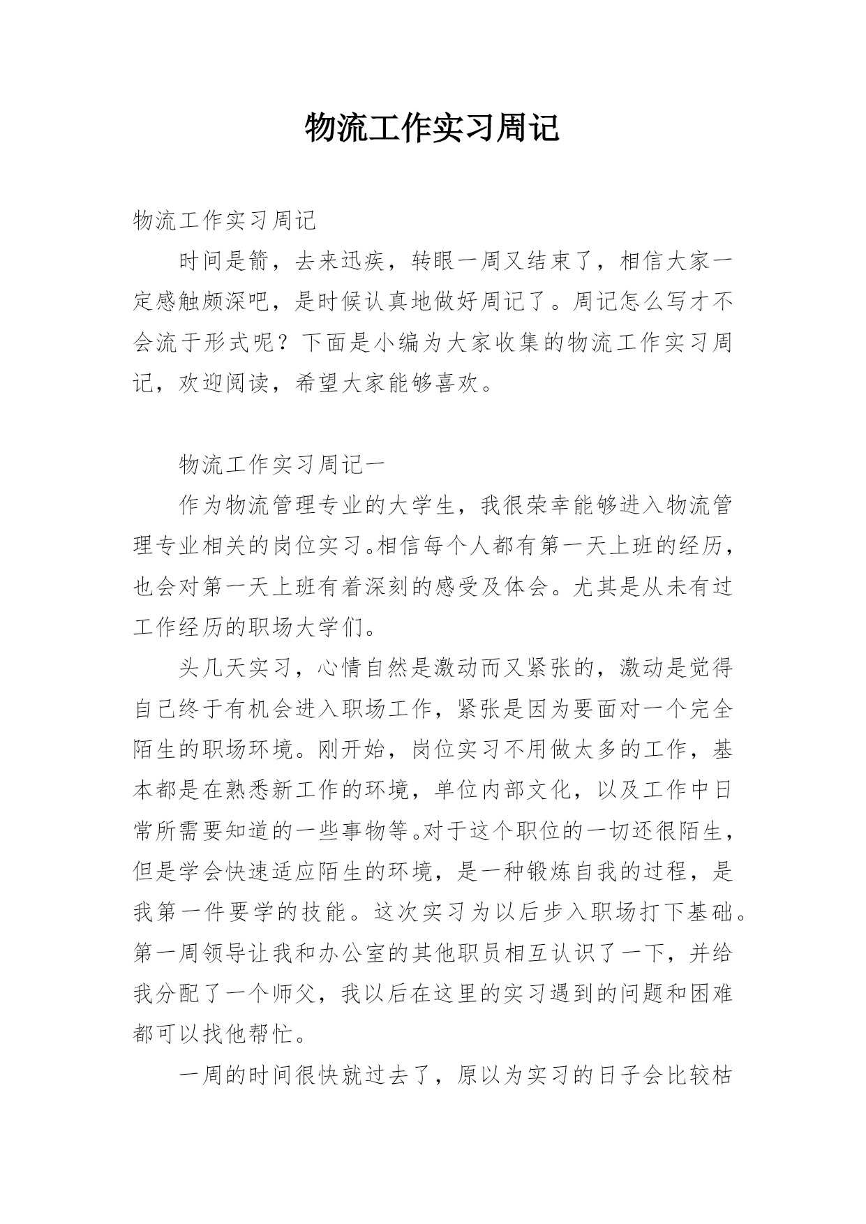 物流工作实习周记物流工作实习周记时间是箭,去来迅疾,转眼一周又结束了,相信大家一定感触颇深吧,是时候认真地做好周记了。周记怎么写才不会流于形式呢?下面是小编为大家收集的物流工作实习周记,欢迎阅读,希望大家能够喜欢。物流工作实习周记一作为物流管理专业的大学生,我很荣幸能够进入物流管理专业相关的岗位实习。相信每个人都有第一天上班的经历,也会对第一天上班有着深刻的感受及体会。尤其是从未有过工作经历的职场大学们。头几天实习,心情自然是激动而又紧张的,激动是觉得自己终于有机会进入职场工作,紧张是因为要面对一个完全陌
