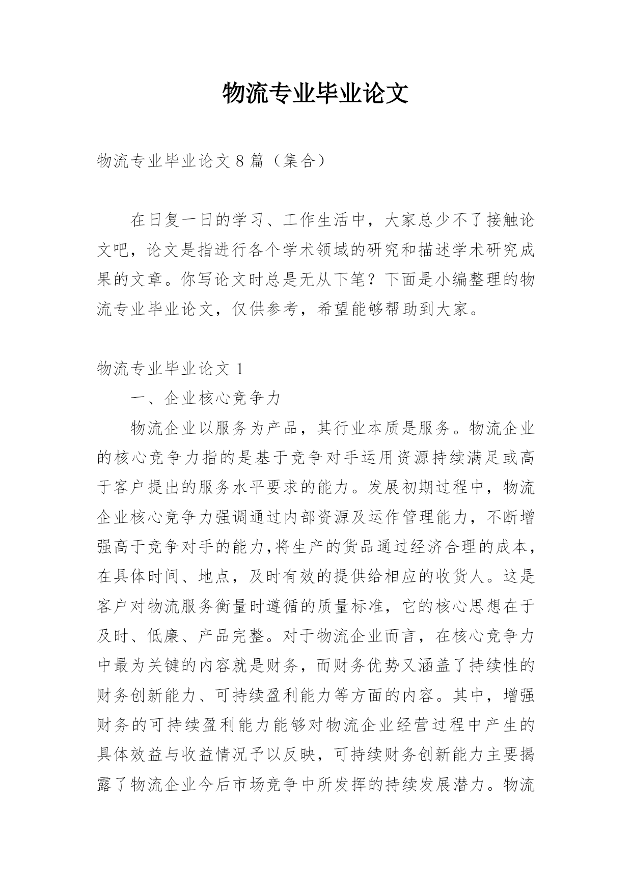 物流专业毕业论文物流专业毕业论文8篇(集合)在日复一日的学习、工作生活中,大家总少不了接触论文吧,论文是指进行各个学术领域的研究和描述学术研究成果的文章。你写论文时总是无从下笔?下面是小编整理的物流专业毕业论文,仅供参考,希望能够帮助到大家。物流专业毕业论文1一、企业核心竞争力物流企业以服务为产品,其行业本质是服务。物流企业的核心竞争力指的是基于竞争对手运用资源持续满足或高于客户提出的服务水平要求的能力。发展初期过程中,物流企业核心竞争力强调通过内部资源及运作管理能力,不断增强高于竞争对手的能力,将生产的