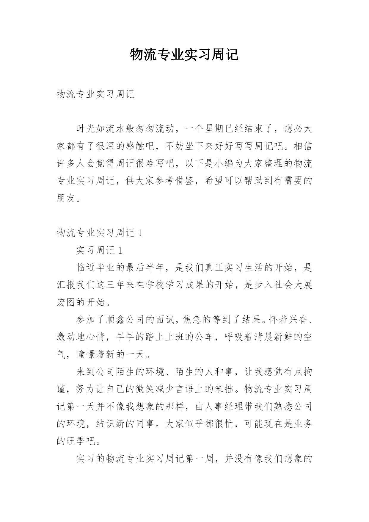 物流专业实习周记物流专业实习周记时光如流水般匆匆流动,一个星期已经结束了,想必大家都有了很深的感触吧,不妨坐下来好好写写周记吧。相信许多人会觉得周记很难写吧,以下是小编为大家整理的物流专业实习周记,供大家参考借鉴,希望可以帮助到有需要的朋友。物流专业实习周记1实习周记1临近毕业的最后半年,是我们真正实习生活的开始,是汇报我们这三年来在学校学习成果的开始,是步入社会大展宏图的开始。参加了顺鑫公司的面试,焦急的等到了结果。怀着兴奋、激动地心情,早早的踏上上班的公车,呼吸着清晨新鲜的空气,憧憬着新的一天。来到公