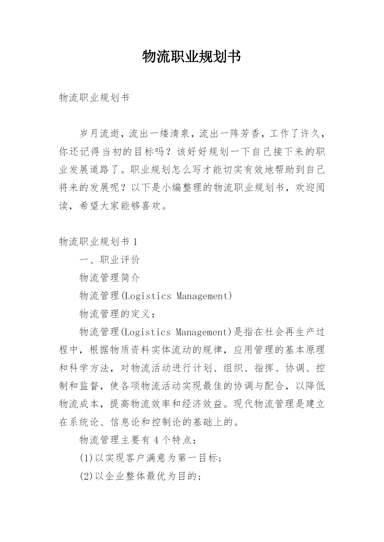 物流职业规划书物流职业规划书岁月流逝,流出一缕清泉,流出一阵芳香,工作了许久,你还记得当初的目标吗?该好好规划一下自己接下来的职业发展道路了。职业规划怎么写才能切实有效地帮助到自己将来的发展呢?以下是小编整理的物流职业规划书,欢迎阅读,希望大家能够喜欢。物流职业规划书1一、职业评价物流管理简介物流管理(LogisticsManagement)物流管理的定义:物流管理(LogisticsManagement)是指在社会再生产过程中,根据物质资料实体流动的规律,应用管理的基本原理和科学方法,对物流活动进行计划