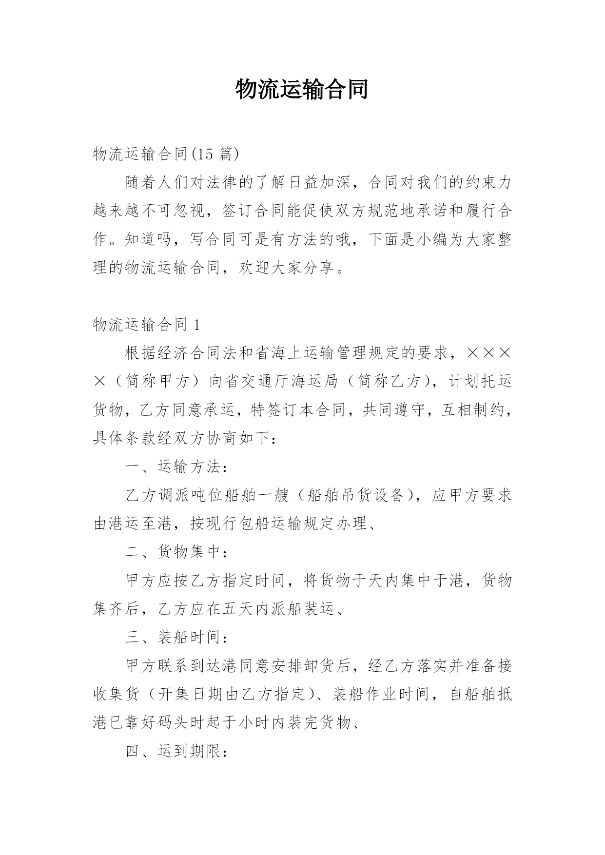 物流运输合同物流运输合同(15篇)随着人们对法律的了解日益加深,合同对我们的约束力越来越不可忽视,签订合同能促使双方规范地承诺和履行合作。知道吗,写合同可是有方法的哦,下面是小编为大家整理的物流运输合同,欢迎大家分享。物流运输合同1根据经济合同法和省海上运输管理规定的要求,××××(简称甲方)向省交通厅海运局(简称乙方),计划托运货物,乙方同意承运,特签订本合同,共同遵守,互相制约,具体条款经双方协商如下:一、运输方法:乙方调派吨位船舶一艘(船舶吊货设备),应甲方要求由港运至港,按现行包船运输规定办理、二