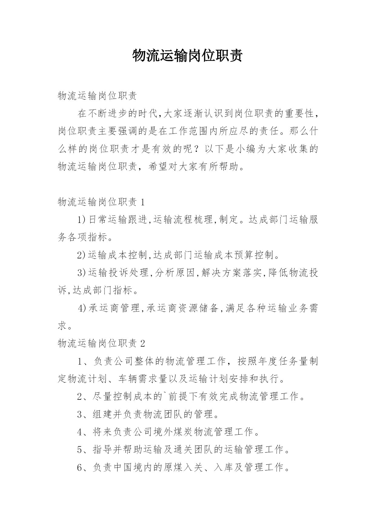 物流运输岗位职责物流运输岗位职责在不断进步的时代,大家逐渐认识到岗位职责的重要性,岗位职责主要强调的是在工作范围内所应尽的责任。那么什么样的岗位职责才是有效的呢?以下是小编为大家收集的物流运输岗位职责,希望对大家有所帮助。物流运输岗位职责11)日常运输跟进,运输流程梳理,制定。达成部门运输服务各项指标。2)运输成本控制,达成部门运输成本预算控制。3)运输投诉处理,分析原因,解决方案落实,降低物流投诉,达成部门指标。4)承运商管理,承运商资源储备,满足各种运输业务需求。物流运输岗位职责21、负责公司整体的物