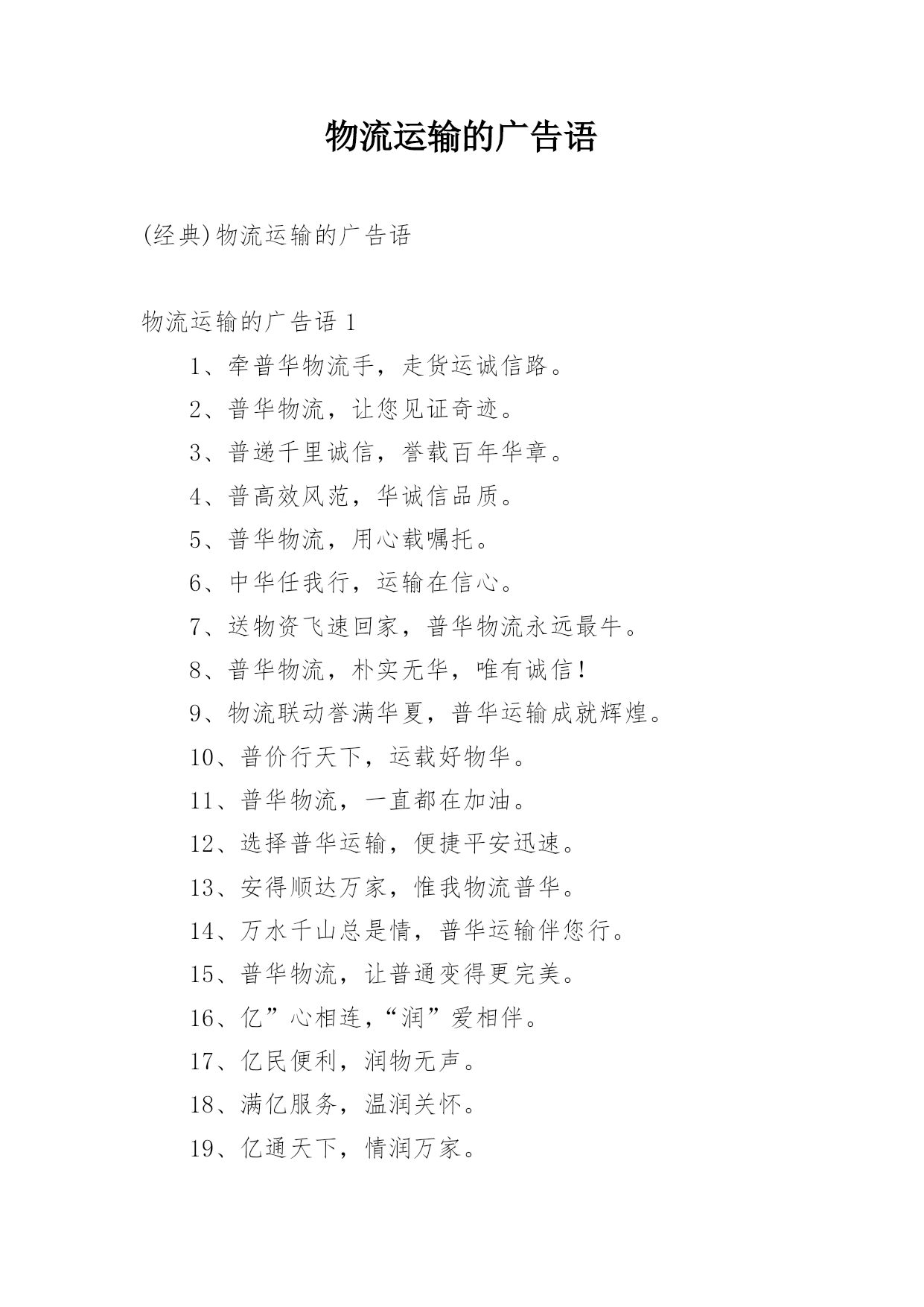 物流运输的广告语(经典)物流运输的广告语物流运输的广告语11、牵普华物流手,走货运诚信路。2、普华物流,让您见证奇迹。3、普递千里诚信,誉载百年华章。4、普高效风范,华诚信品质。5、普华物流,用心载嘱托。6、中华任我行,运输在信心。7、送物资飞速回家,普华物流永远最牛。8、普华物流,朴实无华,唯有诚信!9、物流联动誉满华夏,普华运输成就辉煌。10、普价行天下,运载好物华。11、普华物流,一直都在加油。12、选择普华运输,便捷平安迅速。13、安得顺达万家,惟我物流普华。14、万水千山总是情,普华运输伴您行。