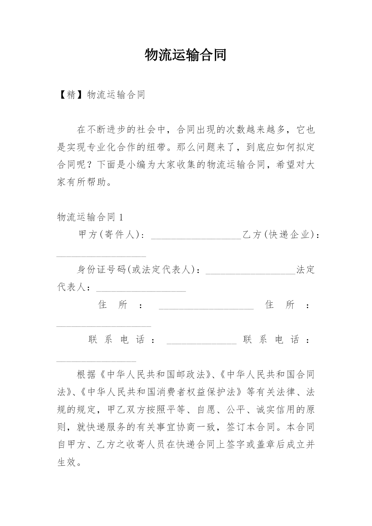 物流运输合同【精】物流运输合同在不断进步的社会中,合同出现的次数越来越多,它也是实现专业化合作的纽带。那么问题来了,到底应如何拟定合同呢?下面是小编为大家收集的物流运输合同,希望对大家有所帮助。物流运输合同1甲方(寄件人):__________________乙方(快递企业):__________________身份证号码(或法定代表人):__________________法定代表人:__________________住所:___________________住所:_________________