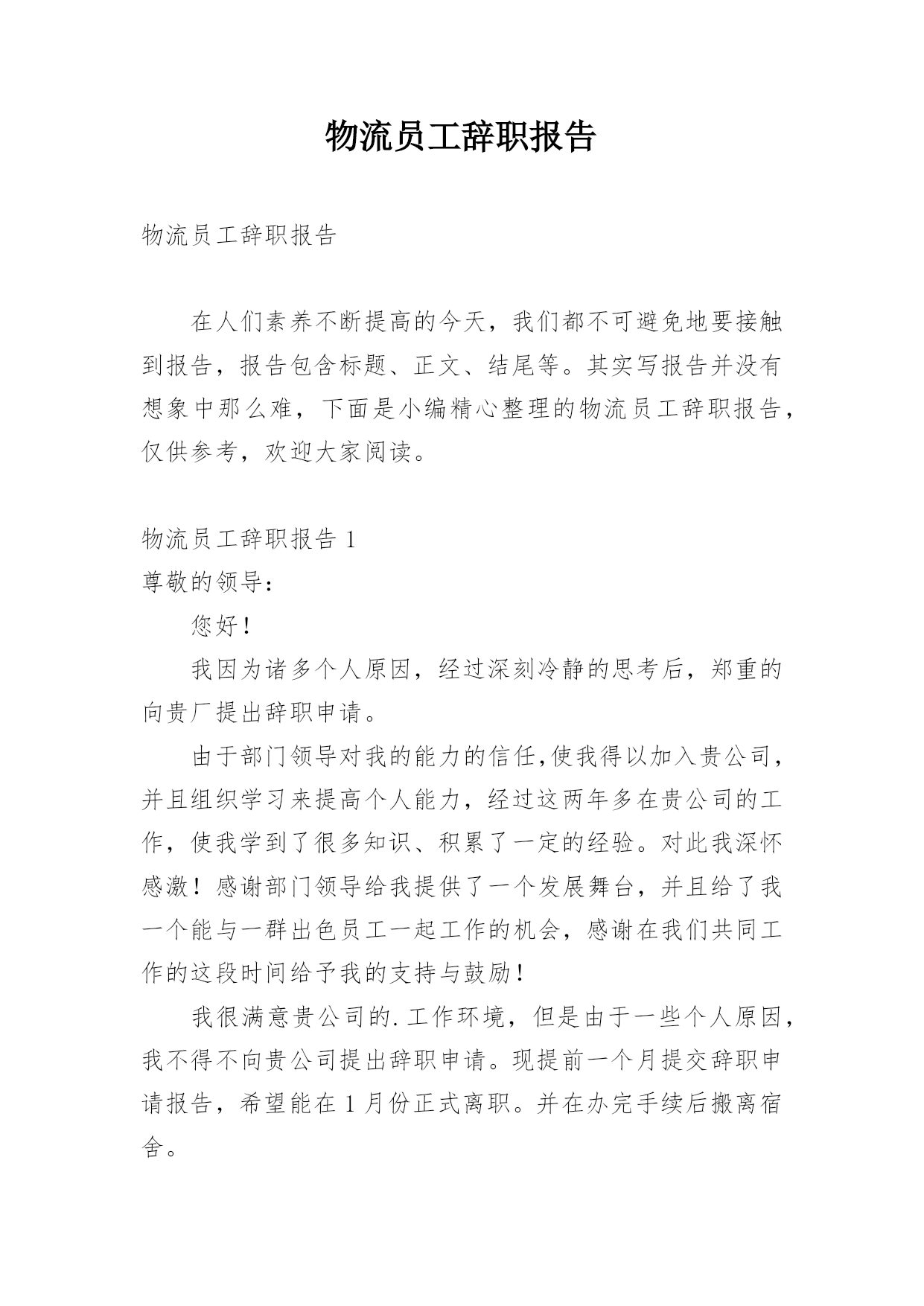 物流员工辞职报告物流员工辞职报告在人们素养不断提高的今天,我们都不可避免地要接触到报告,报告包含标题、正文、结尾等。其实写报告并没有想象中那么难,下面是小编精心整理的物流员工辞职报告,仅供参考,欢迎大家阅读。物流员工辞职报告1尊敬的领导:您好!我因为诸多个人原因,经过深刻冷静的思考后,郑重的向贵厂提出辞职申请。由于部门领导对我的能力的信任,使我得以加入贵公司,并且组织学习来提高个人能力,经过这两年多在贵公司的工作,使我学到了很多知识、积累了一定的经验。对此我深怀感激!感谢部门领导给我提供了一个发展舞台,并