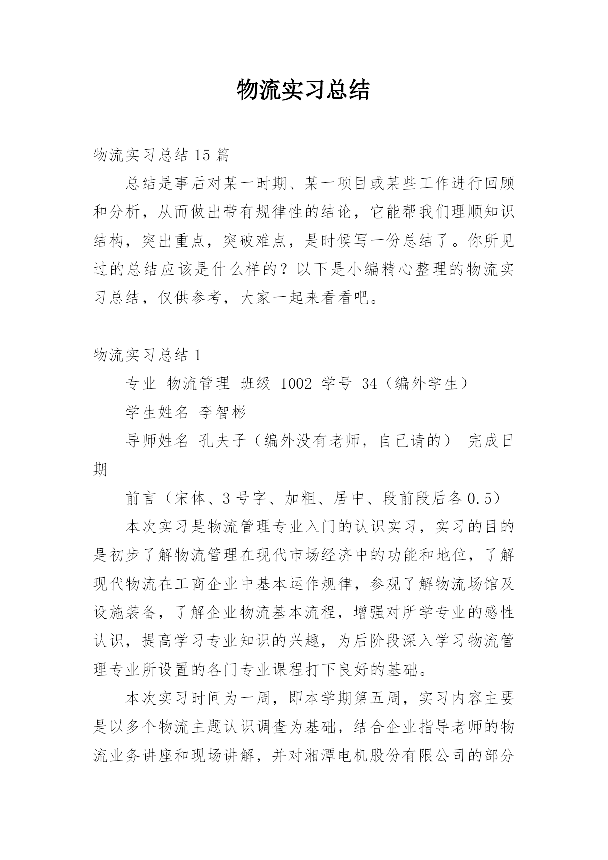 物流实习总结物流实习总结15篇总结是事后对某一时期、某一项目或某些工作进行回顾和分析,从而做出带有规律性的结论,它能帮我们理顺知识结构,突出重点,突破难点,是时候写一份总结了。你所见过的总结应该是什么样的?以下是小编精心整理的物流实习总结,仅供参考,大家一起来看看吧。物流实习总结1专业物流管理班级1002学号34(编外学生)学生姓名李智彬导师姓名孔夫子(编外没有老师,自己请的)完成日期前言(宋体、3号字、加粗、居中、段前段后各0.5)本次实习是物流管理专业入门的认识实习,实习的目的是初步了解物流管理在现代