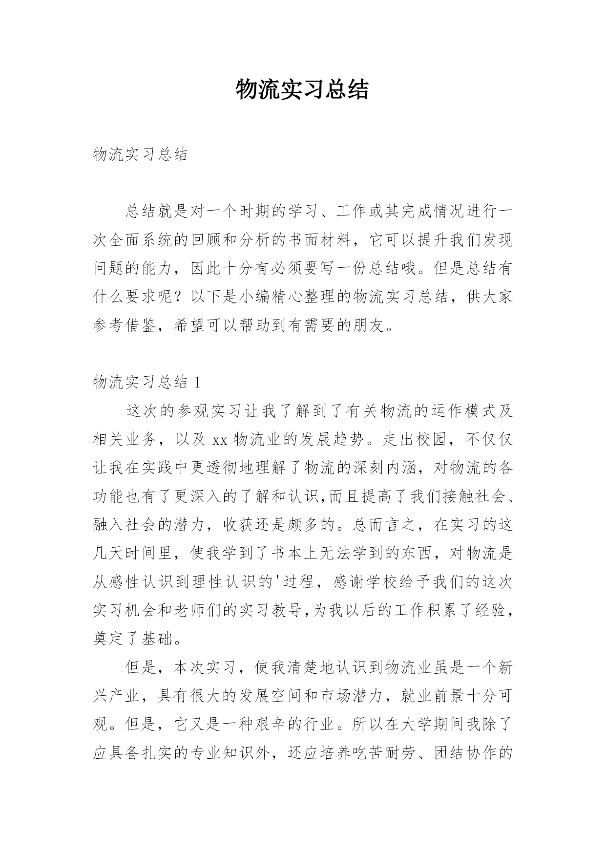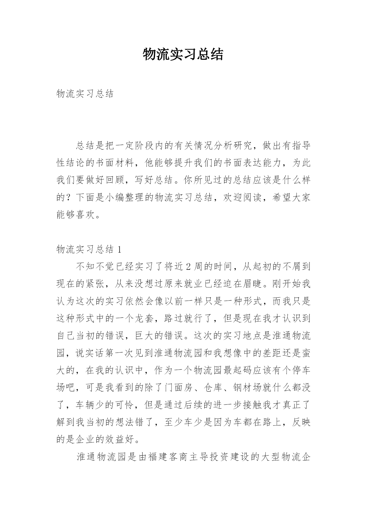 物流实习总结物流实习总结总结就是对一个时期的学习、工作或其完成情况进行一次全面系统的回顾和分析的书面材料,它可以提升我们发现问题的能力,因此十分有必须要写一份总结哦。但是总结有什么要求呢?以下是小编精心整理的物流实习总结,供大家参考借鉴,希望可以帮助到有需要的朋友。物流实习总结1这次的参观实习让我了解到了有关物流的运作模式及相关业务,以及xx物流业的发展趋势。走出校园,不仅仅让我在实践中更透彻地理解了物流的深刻内涵,对物流的各功能也有了更深入的了解和认识,而且提高了我们接触社会、融入社会的潜力,收获还是颇