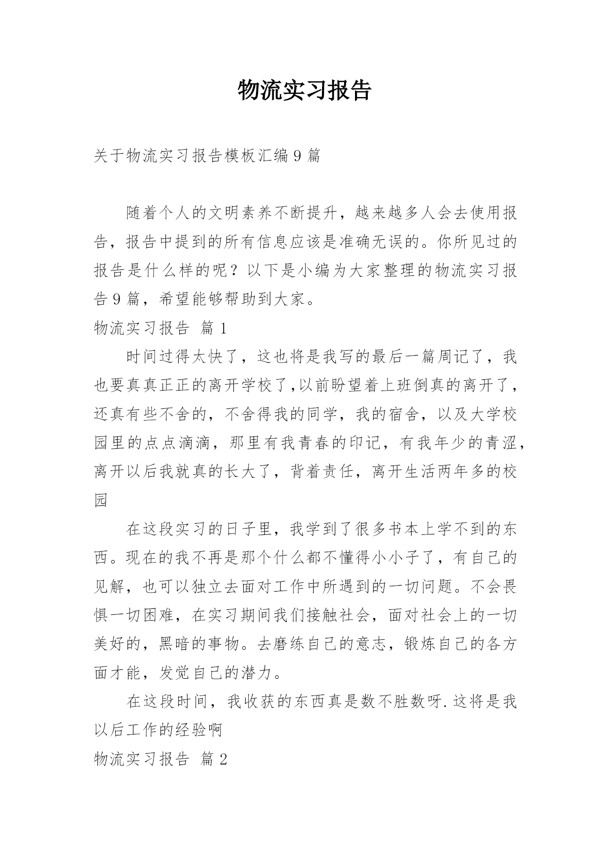 物流实习报告关于物流实习报告模板汇编9篇随着个人的文明素养不断提升,越来越多人会去使用报告,报告中提到的所有信息应该是准确无误的。你所见过的报告是什么样的呢?以下是小编为大家整理的物流实习报告9篇,希望能够帮助到大家。物流实习报告篇1时间过得太快了,这也将是我写的最后一篇周记了,我也要真真正正的离开学校了,以前盼望着上班倒真的离开了,还真有些不舍的,不舍得我的同学,我的宿舍,以及大学校园里的点点滴滴,那里有我青春的印记,有我年少的青涩,离开以后我就真的长大了,背着责任,离开生活两年多的校园在这段实习的日子