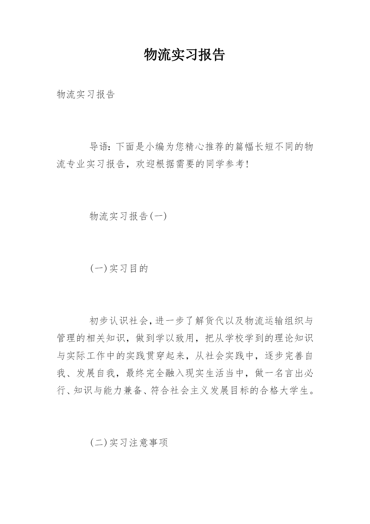 物流实习报告物流实习报告导语:下面是小编为您精心推荐的篇幅长短不同的物流专业实习报告,欢迎根据需要的同学参考!物流实习报告(一)(一)实习目的初步认识社会,进一步了解货代以及物流运输组织与管理的相关知识,做到学以致用,把从学校学到的理论知识与实际工作中的实践贯穿起来,从社会实践中,逐步完善自我、发展自我,最终完全融入现实生活当中,做一名言出必行、知识与能力兼备、符合社会主义发展目标的合格大学生。(二)实习注意事项1、勤学苦练,善于创新,善于思考。2、纸上得来终须浅,绝知此事要躬行。3、灵活处理人际关系(同