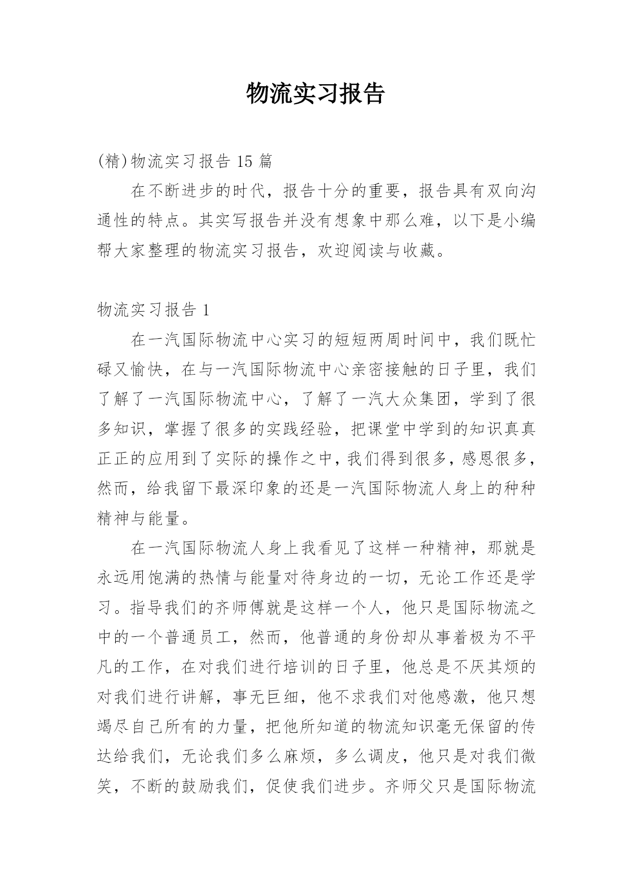 物流实习报告(精)物流实习报告15篇在不断进步的时代,报告十分的重要,报告具有双向沟通性的特点。其实写报告并没有想象中那么难,以下是小编帮大家整理的物流实习报告,欢迎阅读与收藏。物流实习报告1在一汽国际物流中心实习的短短两周时间中,我们既忙碌又愉快,在与一汽国际物流中心亲密接触的日子里,我们了解了一汽国际物流中心,了解了一汽大众集团,学到了很多知识,掌握了很多的实践经验,把课堂中学到的知识真真正正的应用到了实际的操作之中,我们得到很多,感恩很多,然而,给我留下最深印象的还是一汽国际物流人身上的种种精神与能