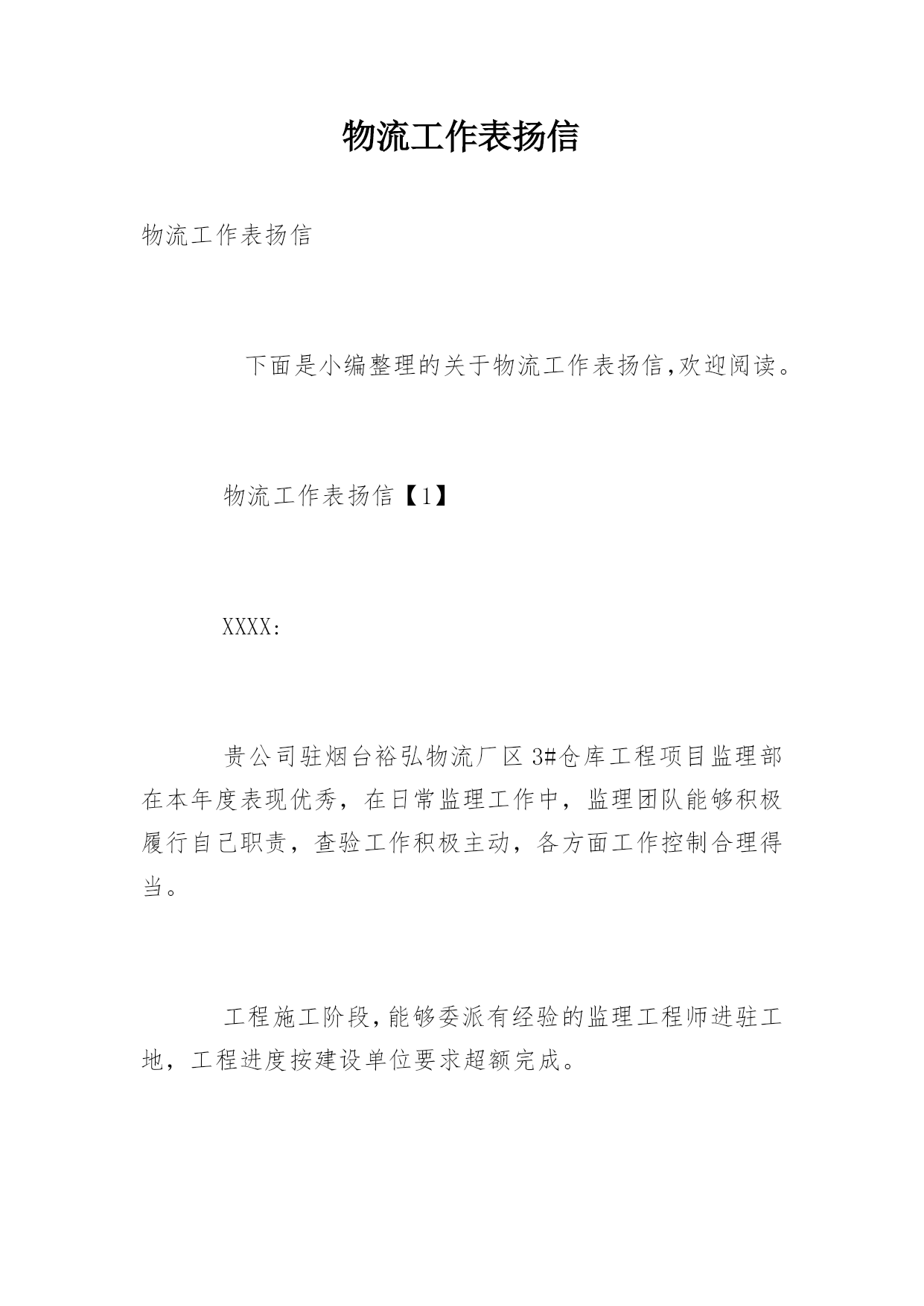 物流工作表扬信物流工作表扬信下面是小编整理的关于物流工作表扬信,欢迎阅读。物流工作表扬信【1】XXXX:贵公司驻烟台裕弘物流厂区3#仓库工程项目监理部在本年度表现优秀,在日常监理工作中,监理团队能够积极履行自己职责,查验工作积极主动,各方面工作控制合理得当。工程施工阶段,能够委派有经验的监理工程师进驻工地,工程进度按建设单位要求超额完成。望贵公司及项目监理部保持一贯良好的工作作风,做好20xx年度的监理工作。总监代表朱志义在施工阶段表现突出,节假日加班加点,工作兢兢业业我公司工程管理部特给予500元奖励