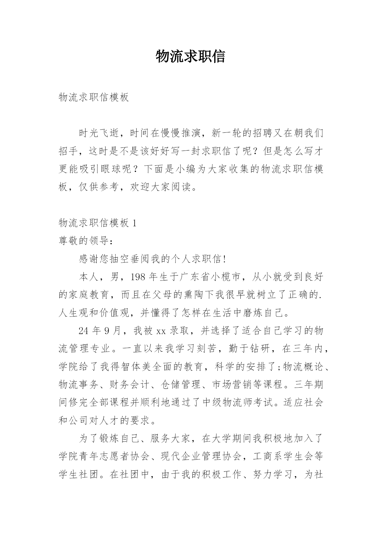 物流求职信物流求职信模板时光飞逝,时间在慢慢推演,新一轮的招聘又在朝我们招手,这时是不是该好好写一封求职信了呢?但是怎么写才更能吸引眼球呢?下面是小编为大家收集的物流求职信模板,仅供参考,欢迎大家阅读。物流求职信模板1尊敬的领导:感谢您抽空垂阅我的个人求职信!本人,男,198年生于广东省小榄市,从小就受到良好的家庭教育,而且在父母的熏陶下我很早就树立了正确的.人生观和价值观,并懂得了怎样在生活中磨炼自己。24年9月,我被xx录取,并选择了适合自己学习的物流管理专业。一直以来我学习刻苦,勤于钻研,在三年内,