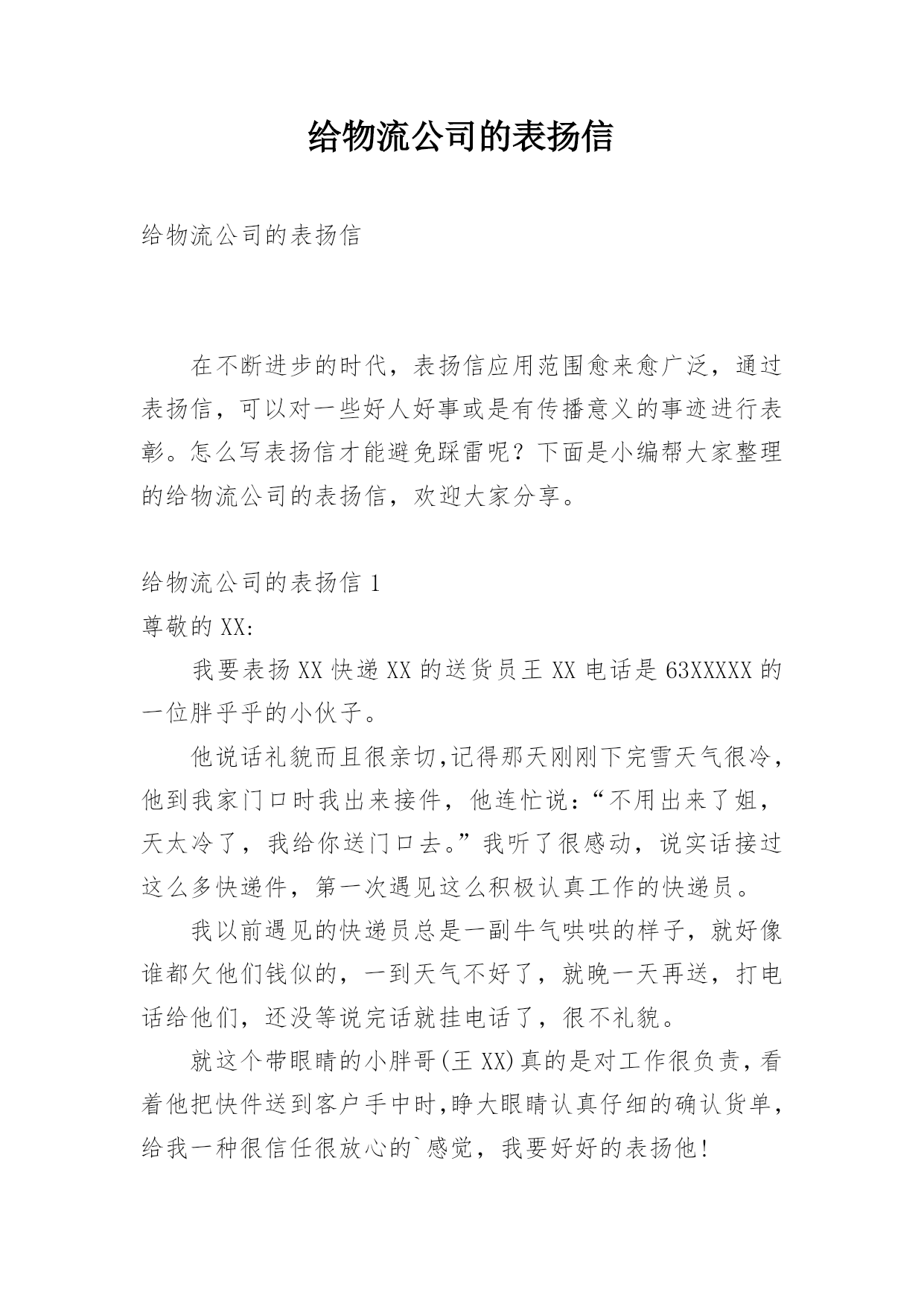 给物流公司的表扬信给物流公司的表扬信在不断进步的时代,表扬信应用范围愈来愈广泛,通过表扬信,可以对一些好人好事或是有传播意义的事迹进行表彰。怎么写表扬信才能避免踩雷呢?下面是小编帮大家整理的给物流公司的表扬信,欢迎大家分享。给物流公司的表扬信1尊敬的XX:我要表扬XX快递XX的送货员王XX电话是63XXXXX的一位胖乎乎的小伙子。他说话礼貌而且很亲切,记得那天刚刚下完雪天气很冷,他到我家门口时我出来接件,他连忙说:“不用出来了姐,天太冷了,我给你送门口去。”我听了很感动,说实话接过这么多快递件,第一次遇见