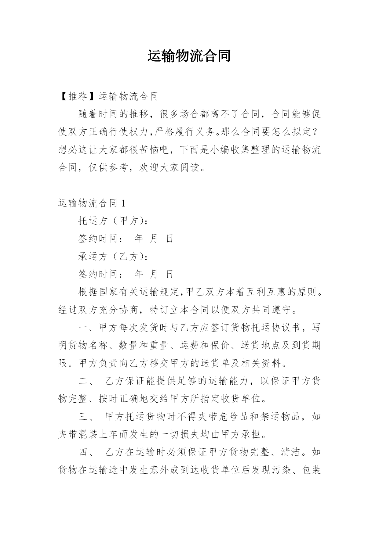 运输物流合同【推荐】运输物流合同随着时间的推移,很多场合都离不了合同,合同能够促使双方正确行使权力,严格履行义务。那么合同要怎么拟定?想必这让大家都很苦恼吧,下面是小编收集整理的运输物流合同,仅供参考,欢迎大家阅读。运输物流合同1托运方(甲方):签约时间:年月日承运方(乙方):签约时间:年月日根据国家有关运输规定,甲乙双方本着互利互惠的原则。经过双方充分协商,特订立本合同以便双方共同遵守。一、甲方每次发货时与乙方应签订货物托运协议书,写明货物名称、数量和重量、运费和保价、送货地点及到货期限。甲方负责向乙方