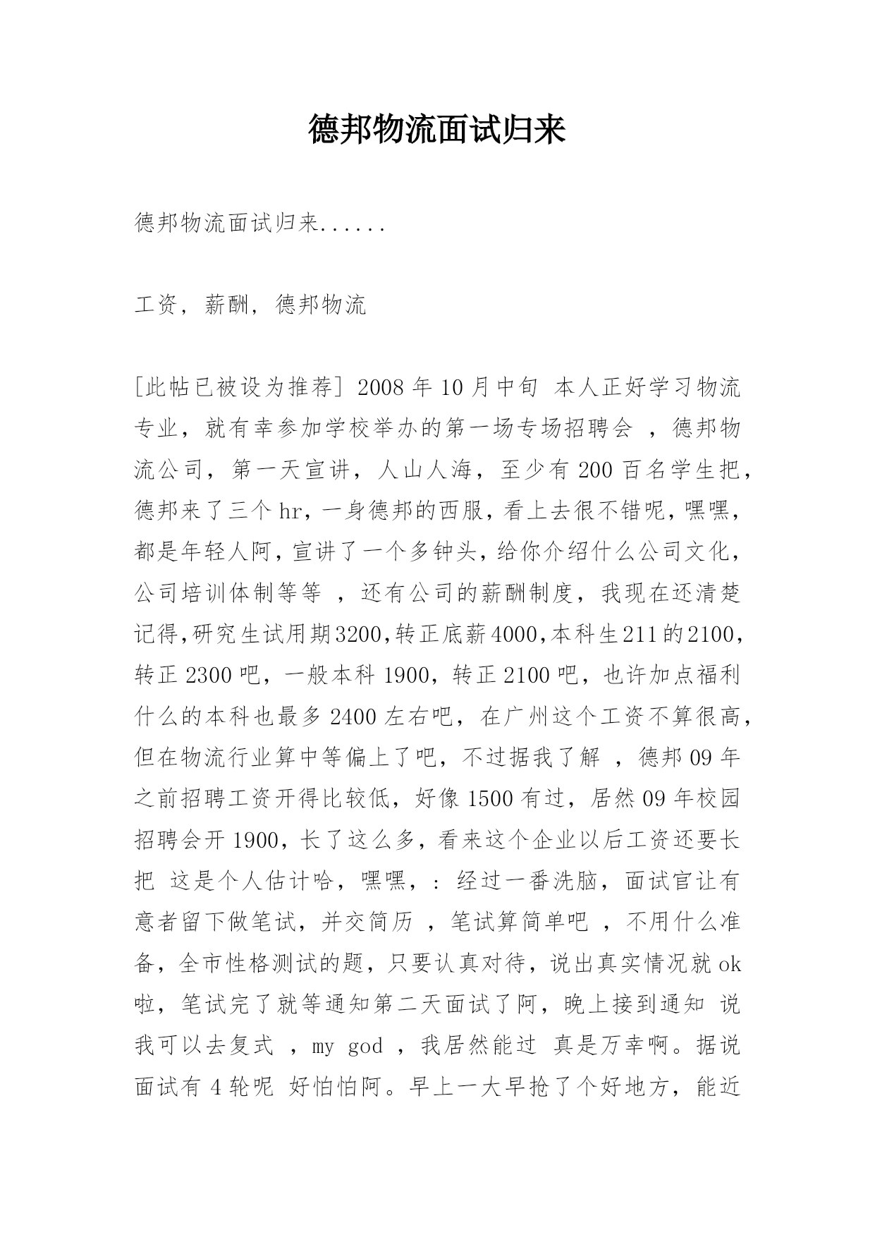 德邦物流面试归来德邦物流面试归来......工资,薪酬,德邦物流[此帖已被设为推荐]2008年10月中旬本人正好学习物流专业,就有幸参加学校举办的第一场专场招聘会,德邦物流公司,第一天宣讲,人山人海,至少有200百名学生把,德邦来了三个hr,一身德邦的西服,看上去很不错呢,嘿嘿,都是年轻人阿,宣讲了一个多钟头,给你介绍什么公司文化,公司培训体制等等,还有公司的薪酬制度,我现在还清楚记得,研究生试用期3200,转正底薪4000,本科生211的2100,转正2300吧,一般本科1900,转正2100吧,也许加