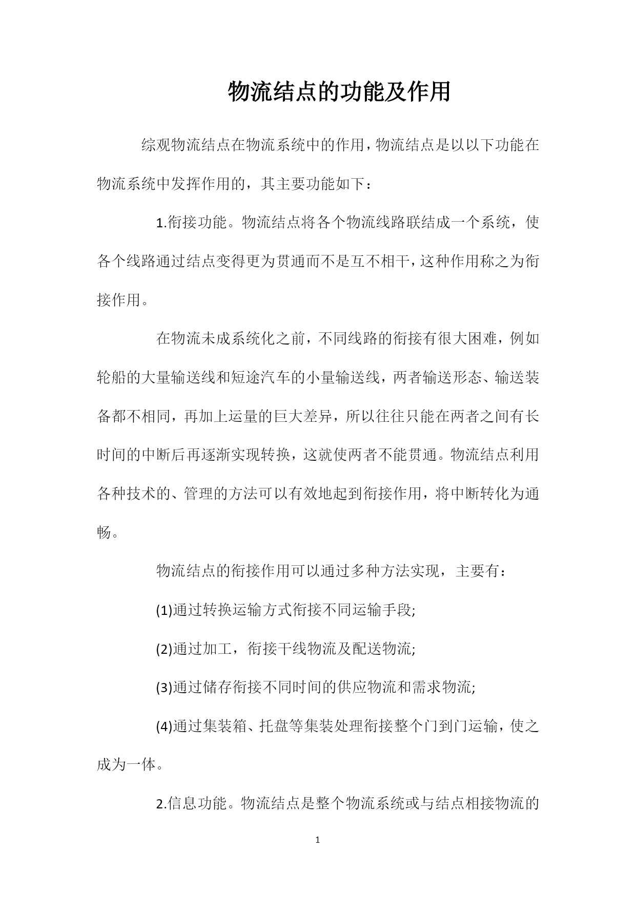 PAGEPAGE2物流结点的功能及作用综观物流结点在物流系统中的作用,物流结点是以以下功能在物流系统中发挥作用的,其主要功能如下:1.衔接功能。物流结点将各个物流线路联结成一个系统,使各个线路通过结点变得更为贯通而不是互不相干,这种作用称之为衔接作用。在物流未成系统化之前,不同线路的衔接有很大困难,例如轮船的大量输送线和短途汽车的小量输送线,两者输送形态、输送装备都不相同,再加上运量的巨大差异,所以往往只能在两者之间有长时间的中断后再逐渐实现转换,这就使两者不能贯通。物流结点利用各种技术的、管