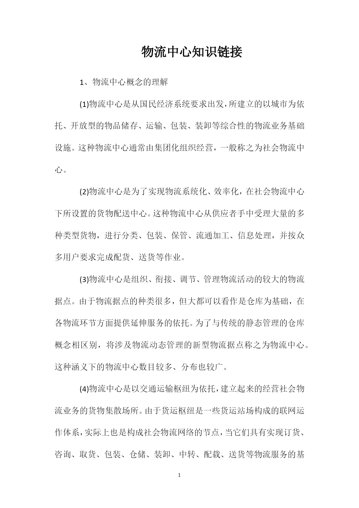PAGEPAGE13物流中心知识链接1、物流中心概念的理解(1)物流中心是从国民经济系统要求出发,所建立的以城市为依托、开放型的物品储存、运输、包装、装卸等综合性的物流业务基础设施。这种物流中心通常由集团化组织经营,一般称之为社会物流中心。(2)物流中心是为了实现物流系统化、效率化,在社会物流中心下所设置的货物配送中心。这种物流中心从供应者手中受理大量的多种类型货物,进行分类、包装、保管、流通加工、信息处理,并按众多用户要求完成配货、送货等作业。(3)物流中心是组织、衔接、调节、管理物流活动的