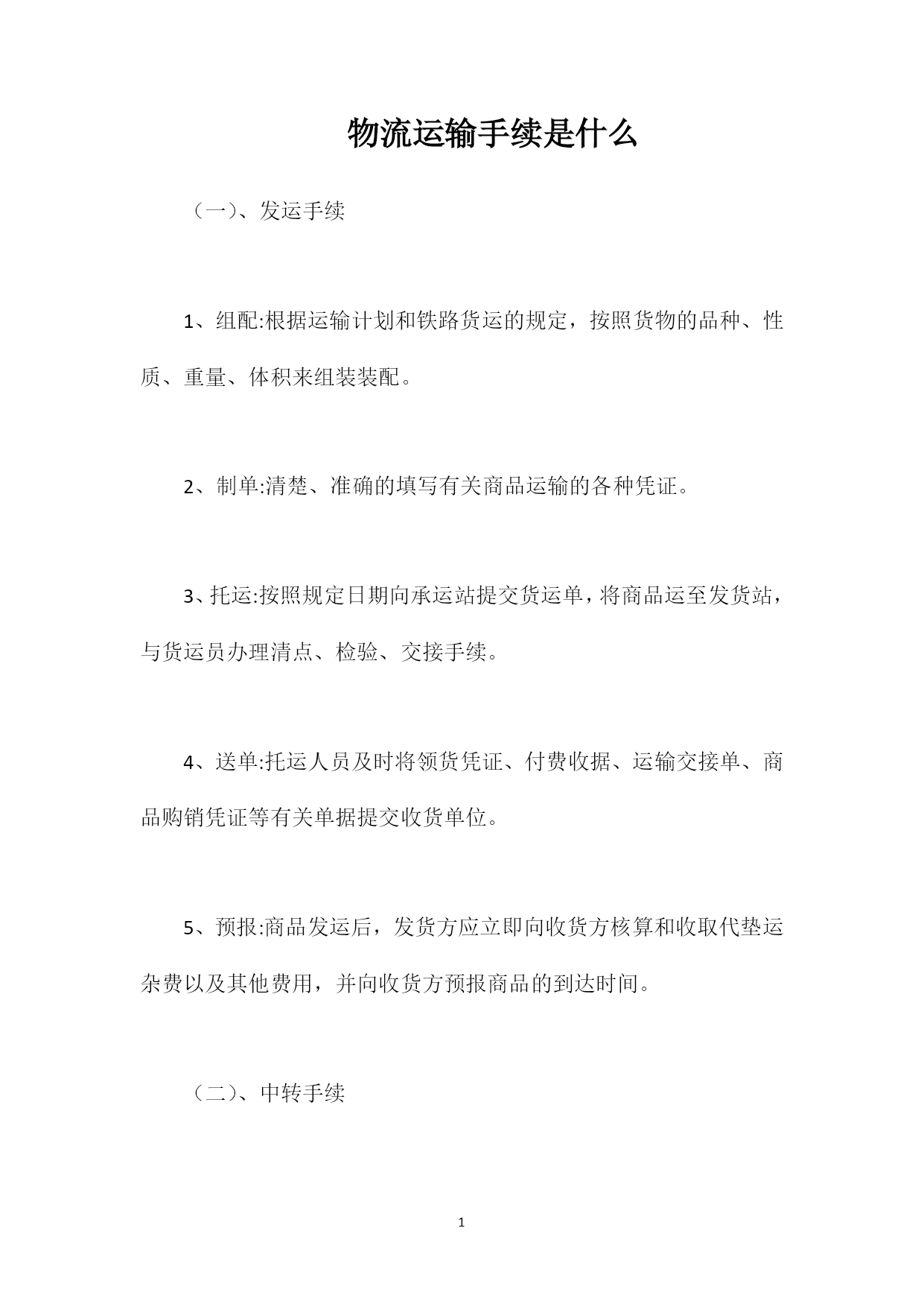 PAGEPAGE2物流运输手续是什么(一)、发运手续1、组配:根据运输计划和铁路货运的规定,按照货物的品种、性质、重量、体积来组装装配。2、制单:清楚、准确的填写有关商品运输的各种凭证。3、托运:按照规定日期向承运站提交货运单,将商品运至发货站,与货运员办理清点、检验、交接手续。4、送单:托运人员及时将领货凭证、付费收据、运输交接单、商品购销凭证等有关单据提交收货单位。5、预报:商品发运后,发货方应立即向收货方核算和收取代垫运杂费以及其他费用,并向收货方预报商品的到达时间。(二)、中转手续1、