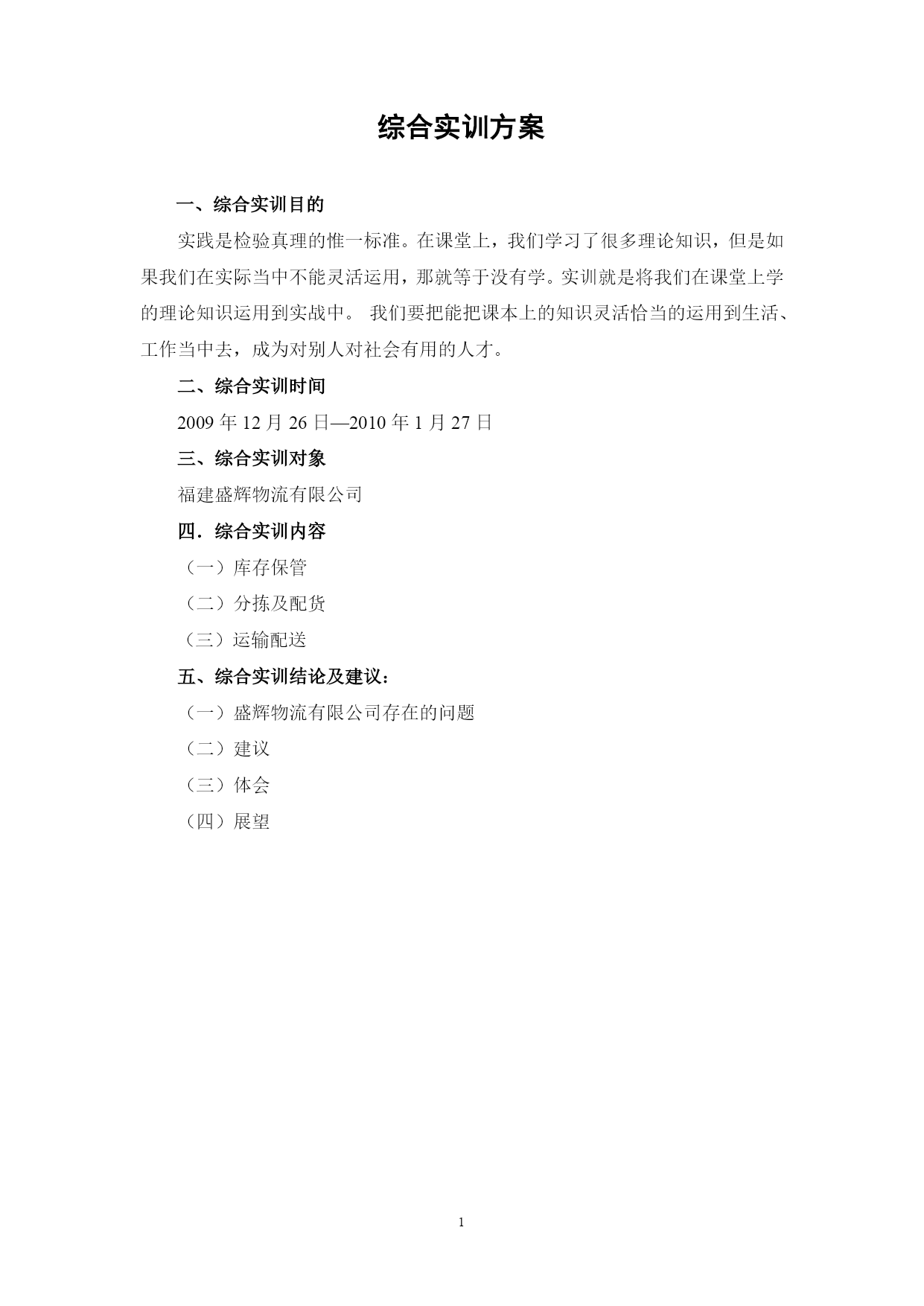 PAGEPAGE5综合实训方案一、综合实训目的实践是检验真理的惟一标准。在课堂上,我们学习了很多理论知识,但是如果我们在实际当中不能灵活运用,那就等于没有学。实训就是将我们在课堂上学的理论知识运用到实战中。我们要把能把课本上的知识灵活恰当的运用到生活、工作当中去,成为对别人对社会有用的人才。二、综合实训时间2009年12月26日—2010年1月27日三、综合实训对象福建盛辉物流有限公司四.综合实训内容(一)库存保管(二)分拣及配货(三)运输配送五、综合实训结论及建议:(一)盛辉物流有限公司存在