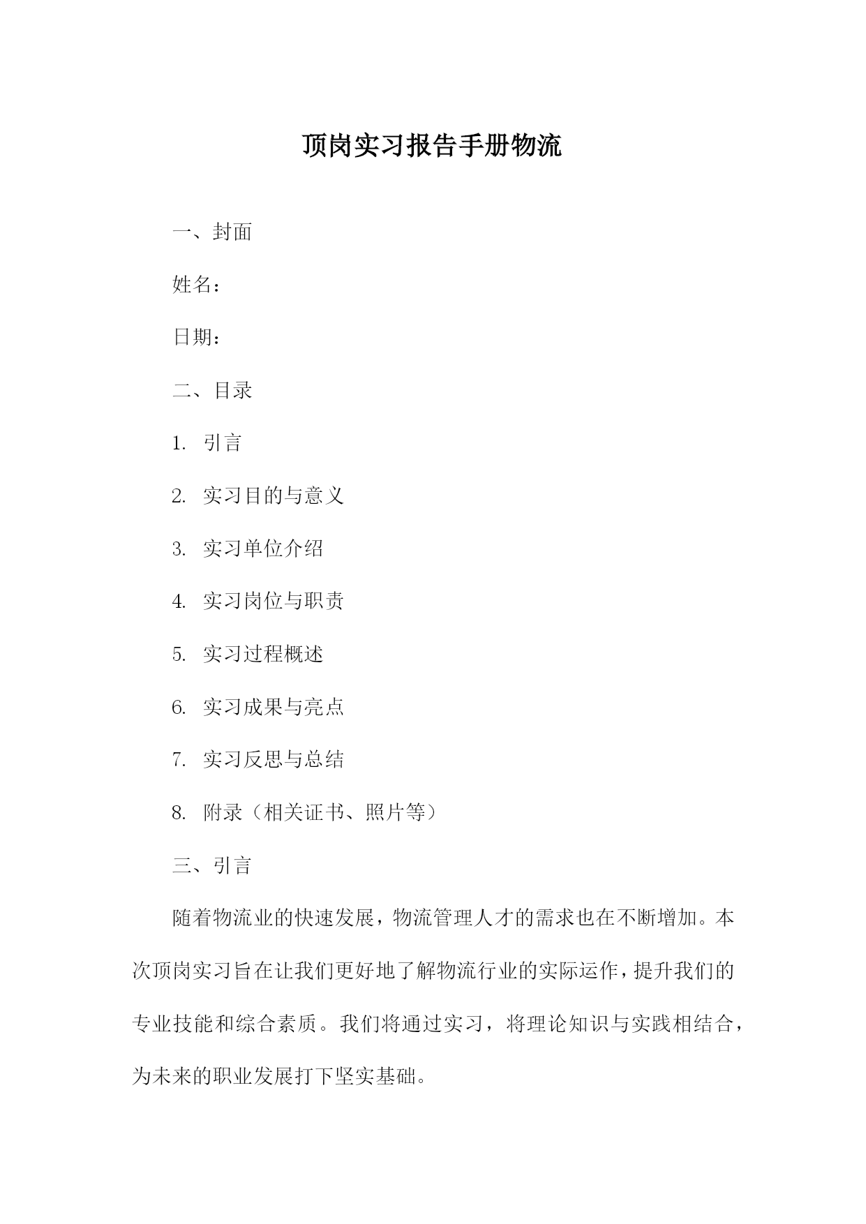 顶岗实习报告手册物流一、封面姓名:日期:二、目录1.引言2.实习目的与意义3.实习单位介绍4.实习岗位与职责5.实习过程概述6.实习成果与亮点7.实习反思与总结8.附录(相关证书、照片等)三、引言随着物流业的快速发展,物流管理人才的需求也在不断增加。本次顶岗实习旨在让我们更好地了解物流行业的实际运作,提升我们的专业技能和综合素质。我们将通过实习,将理论知识与实践相结合,为未来的职业发展打下坚实基础。四、实习目的与意义1.了解物流企业的运营模式和管理体系2.掌握物流市场的需求和竞争态势3.提高物流规划、配送
