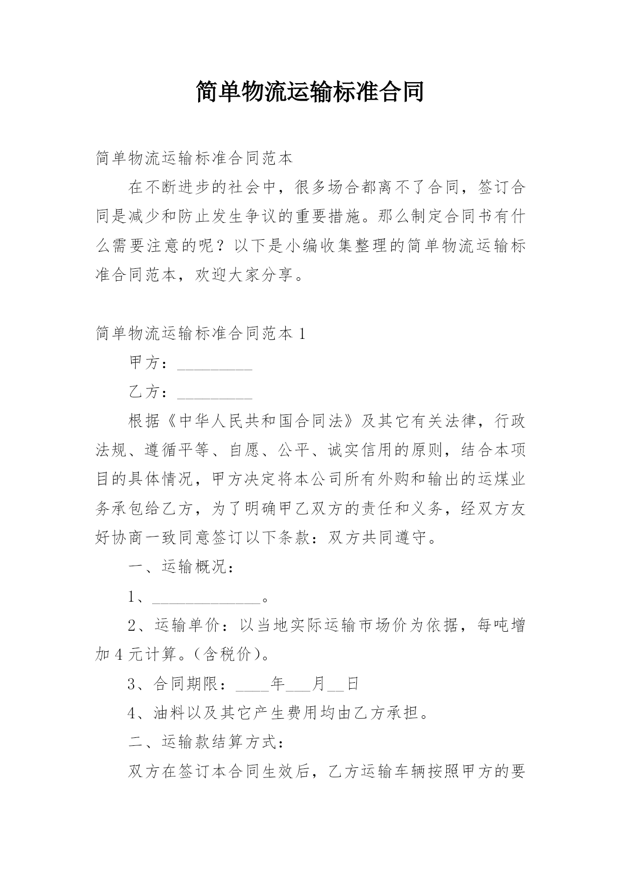 简单物流运输标准合同简单物流运输标准合同范本在不断进步的社会中,很多场合都离不了合同,签订合同是减少和防止发生争议的重要措施。那么制定合同书有什么需要注意的呢?以下是小编收集整理的简单物流运输标准合同范本,欢迎大家分享。简单物流运输标准合同范本1甲方:_________乙方:_________根据《中华人民共和国合同法》及其它有关法律,行政法规、遵循平等、自愿、公平、诚实信用的原则,结合本项目的具体情况,甲方决定将本公司所有外购和输出的运煤业务承包给乙方,为了明确甲乙双方的责任和义务,经双方友好协商一致同