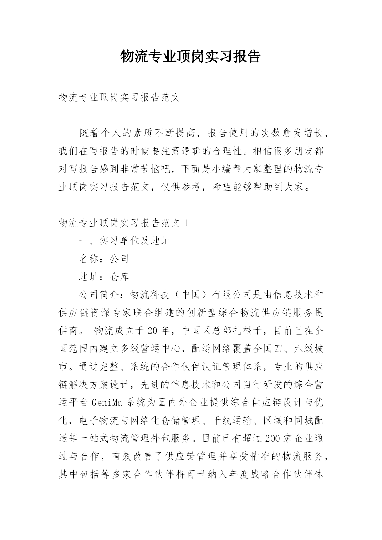 物流专业顶岗实习报告物流专业顶岗实习报告范文随着个人的素质不断提高,报告使用的次数愈发增长,我们在写报告的时候要注意逻辑的合理性。相信很多朋友都对写报告感到非常苦恼吧,下面是小编帮大家整理的物流专业顶岗实习报告范文,仅供参考,希望能够帮助到大家。物流专业顶岗实习报告范文1一、实习单位及地址名称:公司地址:仓库公司简介:物流科技(中国)有限公司是由信息技术和供应链资深专家联合组建的创新型综合物流供应链服务提供商。物流成立于20年,中国区总部扎根于,目前已在全国范围内建立多级营运中心,配送网络覆盖全国四、六级