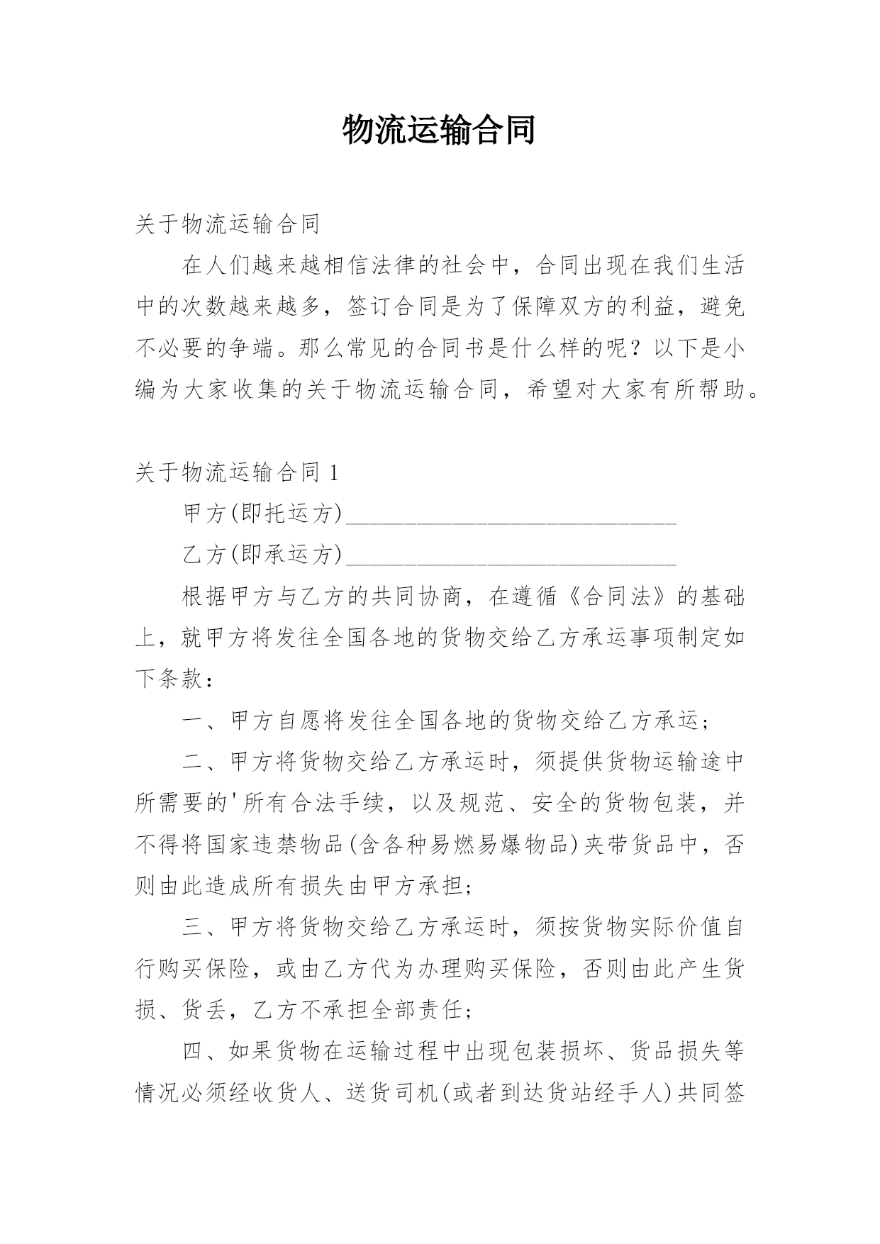 物流运输合同关于物流运输合同在人们越来越相信法律的社会中,合同出现在我们生活中的次数越来越多,签订合同是为了保障双方的利益,避免不必要的争端。那么常见的合同书是什么样的呢?以下是小编为大家收集的关于物流运输合同,希望对大家有所帮助。关于物流运输合同1甲方(即托运方)____________________________乙方(即承运方)____________________________根据甲方与乙方的共同协商,在遵循《合同法》的基础上,就甲方将发往全国各地的货物交给乙方承运事项制定如下条款:一、甲方